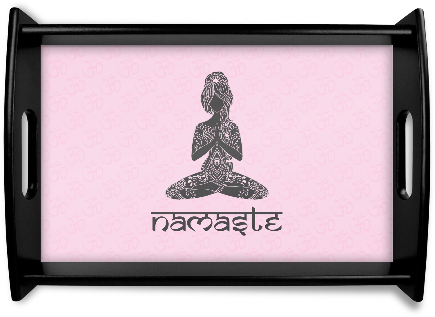 This design is customizable. We chose to use the om background with two shades of pink. We have other yoga backgrounds that you can choose from. We chose the large graphic and text style, where the graphic is of a beautiful woman sitting in lotus pose with prayer hands in pink and dark grey. We have many different yoga graphics that you can choose from including the tree pose and meditation pose. We chose to use the word Namaste in the Sanskrit font. You can choose the personalization, the font and the colors.