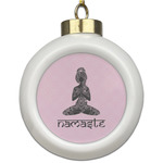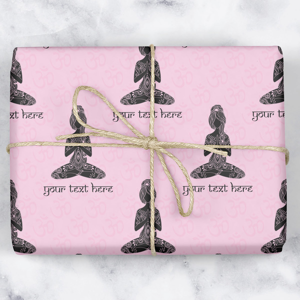 This design is customizable. We chose to use the om background with two shades of pink. We have other yoga backgrounds that you can choose from. We chose the large graphic and text style, where the graphic is of a beautiful woman sitting in lotus pose with prayer hands in pink and dark grey. We have many different yoga graphics that you can choose from including the tree pose and meditation pose. We chose to use the word Namaste in the Sanskrit font. You can choose the personalization, the font and the colors.