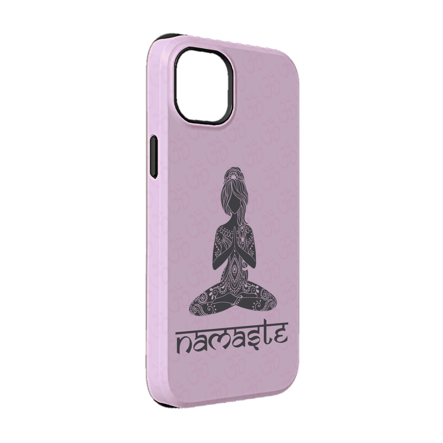 This design is customizable. We chose to use the om background with two shades of pink. We have other yoga backgrounds that you can choose from. We chose the large graphic and text style, where the graphic is of a beautiful woman sitting in lotus pose with prayer hands in pink and dark grey. We have many different yoga graphics that you can choose from including the tree pose and meditation pose. We chose to use the word Namaste in the Sanskrit font. You can choose the personalization, the font and the colors.