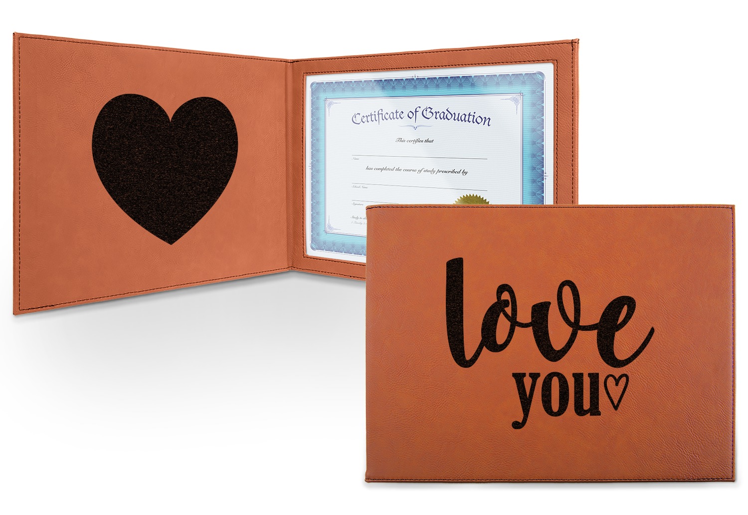 This cognac-colored, leatherette certificate jacket is the ideal way to display or store your hard-earned certificate. When closed, the custom certificate holder measures at 12 by 9 inches. The interior of the certificate cover includes a clear, vinyl window to encase your diploma. The window measures at around 10.5 by 7.5 inches and can accommodate a diploma that measures at up to 8.5 by 11 inches. You can either choose to have your customization laser engraved on the front and interior, or solely the front.