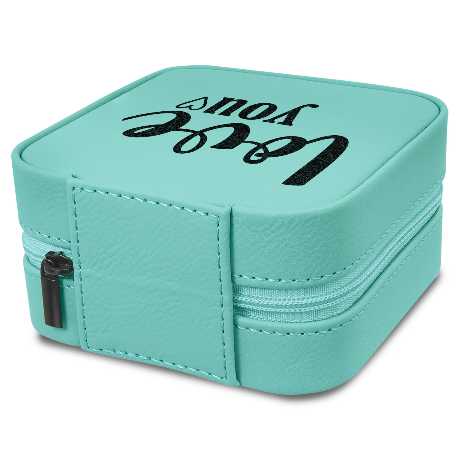 This square zippered travel jewelry box is made from leatherette and is available in four colors - classic cognac / rawhide, a beautiful teal. navy blue or pink. The tan colored soft velvet inside has compartments and hooks for all your jewelry - rings, chains, earrings, bangles etc.