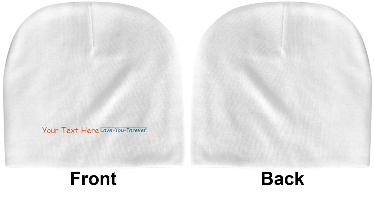 This baby beanie is made of a soft-to-the-touch polyester that is gentle against your babys delicate skin. Ideal for babies aged 0 to 6 months, these newborn hats are perfect for coming home from the hospital, or simply wearing around the house. The hat itself measures at 6 by 6 inches and displays your customization on the outside.
