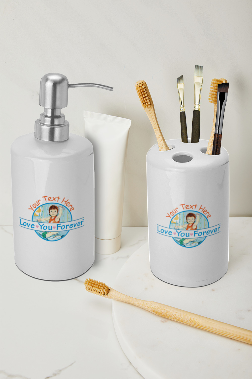 This set can be personalized with a design, name or monogram or both. You can change the color and front until its especially and perfectly your own. Order two and create a his and her.