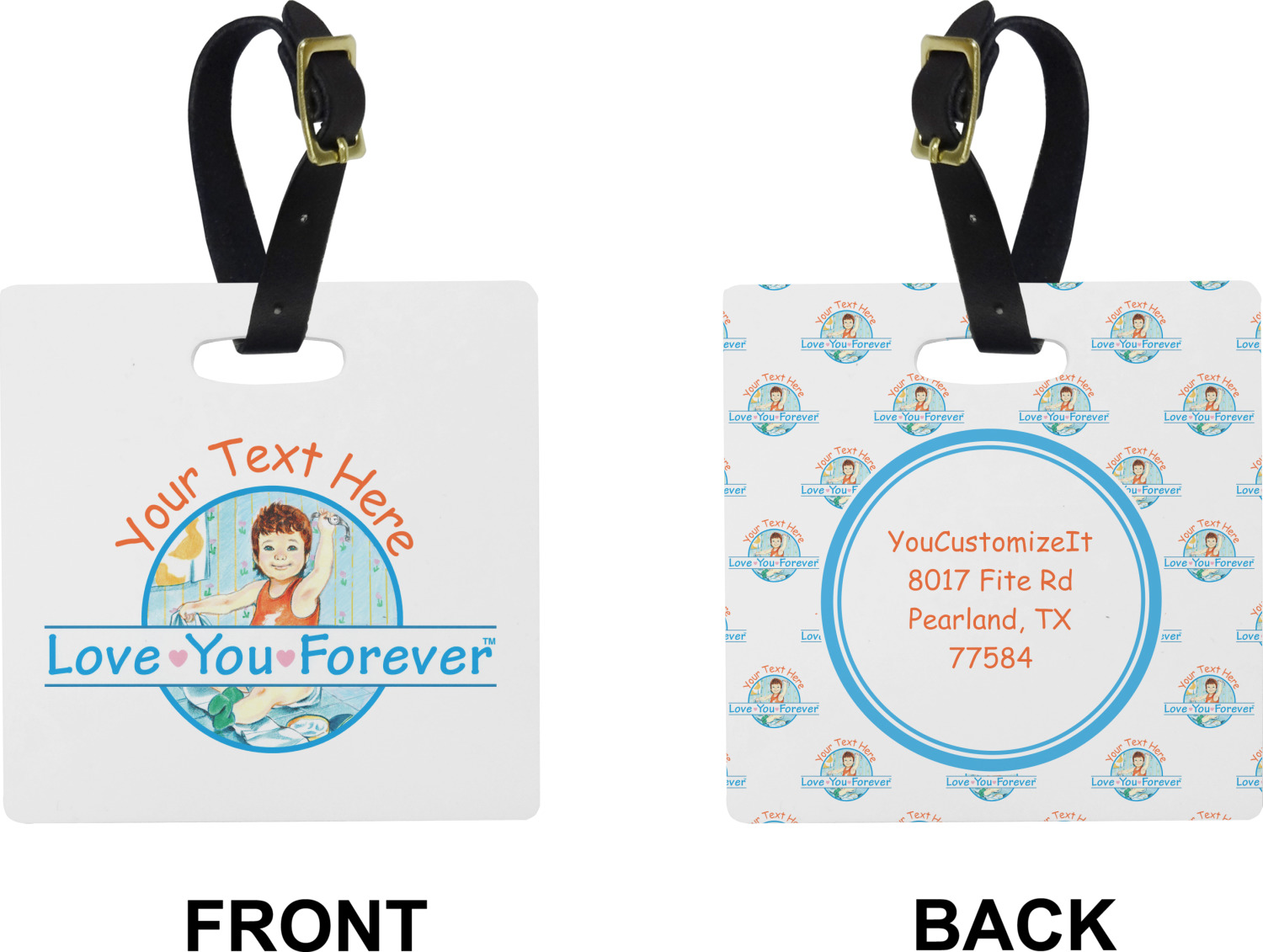 These cute luggage tags are made of a fiber-reinforced, UV-resistant plastic, making them waterproof and durable enough for both everyday use and the rugged adventures of any traveler! A leather strap with holes and a buckle is included with your purchase and can be used to attach your custom luggage tag to any suitcase, backpack, or duffel bag. You can design these travel tags as you wish; your customization will be displayed across the front, while the back will show as little or as much personal information as you want.