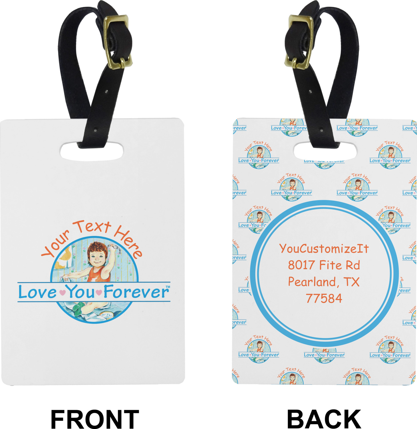 These cute luggage tags are made of a fiber-reinforced, UV-resistant plastic, making them waterproof and durable enough for both everyday use and the rugged adventures of any traveler! A leather strap with holes and a buckle is included with your purchase and can be used to attach your custom luggage tag to any suitcase, backpack, or duffel bag. You can design these travel tags as you wish; your customization will be displayed across the front, while the back will show as little or as much personal information as you want.