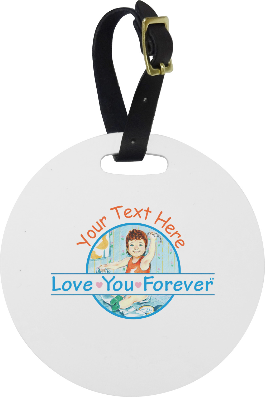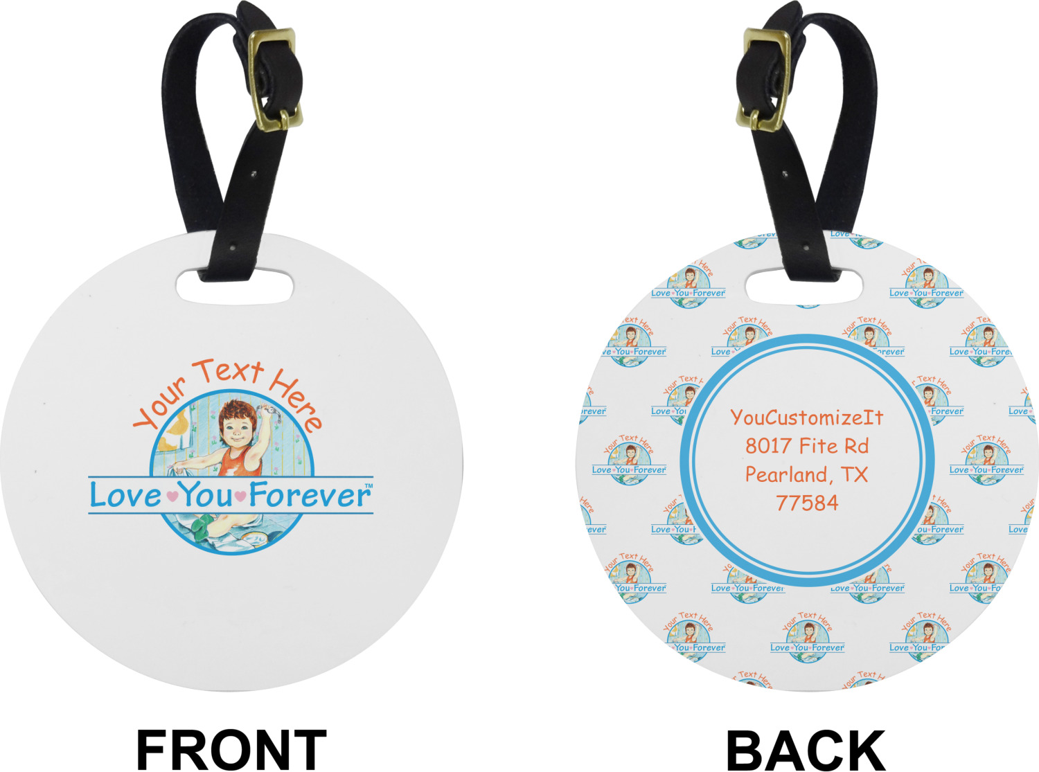 These personalized bag tags are sold in a variety of shapes, so that you may find the product that meets your vision exactly. We sell a round luggage tag, which measures at approximately 4" x 4". Our square luggage tag is about 3.5" x 3.5", while our rectangular version is 2.75" x 4 ".