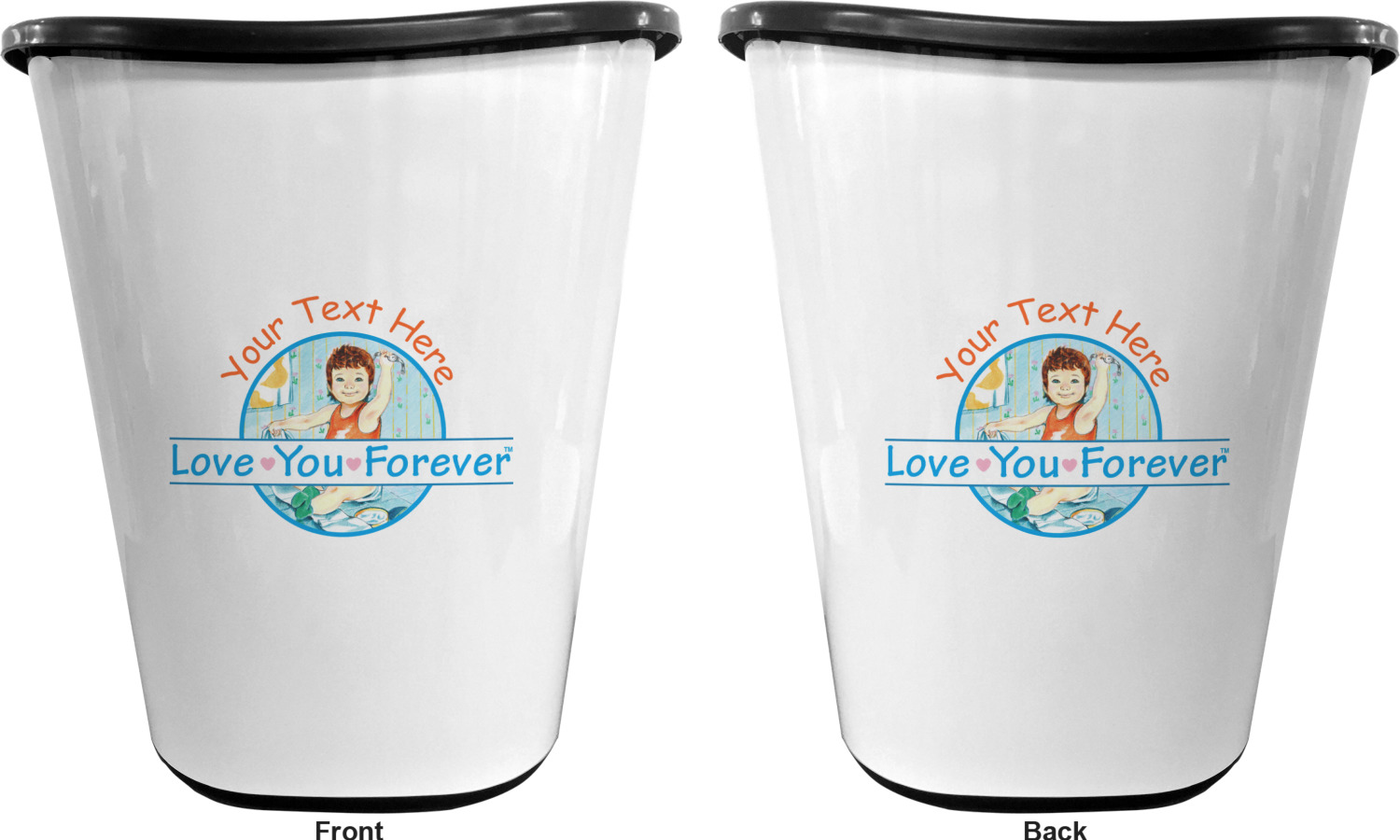 You can choose to purchase these decorative wastebaskets in either a white or a black color that will show on the base and the upper rim. Your customization is printed on a high-gloss, fine-quality vinyl adhesive, and you can choose to either have this adhesive applied to one side only or to both sides. As such, this plastic wastebasket can be single-sided or double-sided, depending on your creative vision. Your customization is printed using durable inks, making the design waterproof and resistant to fading over time.