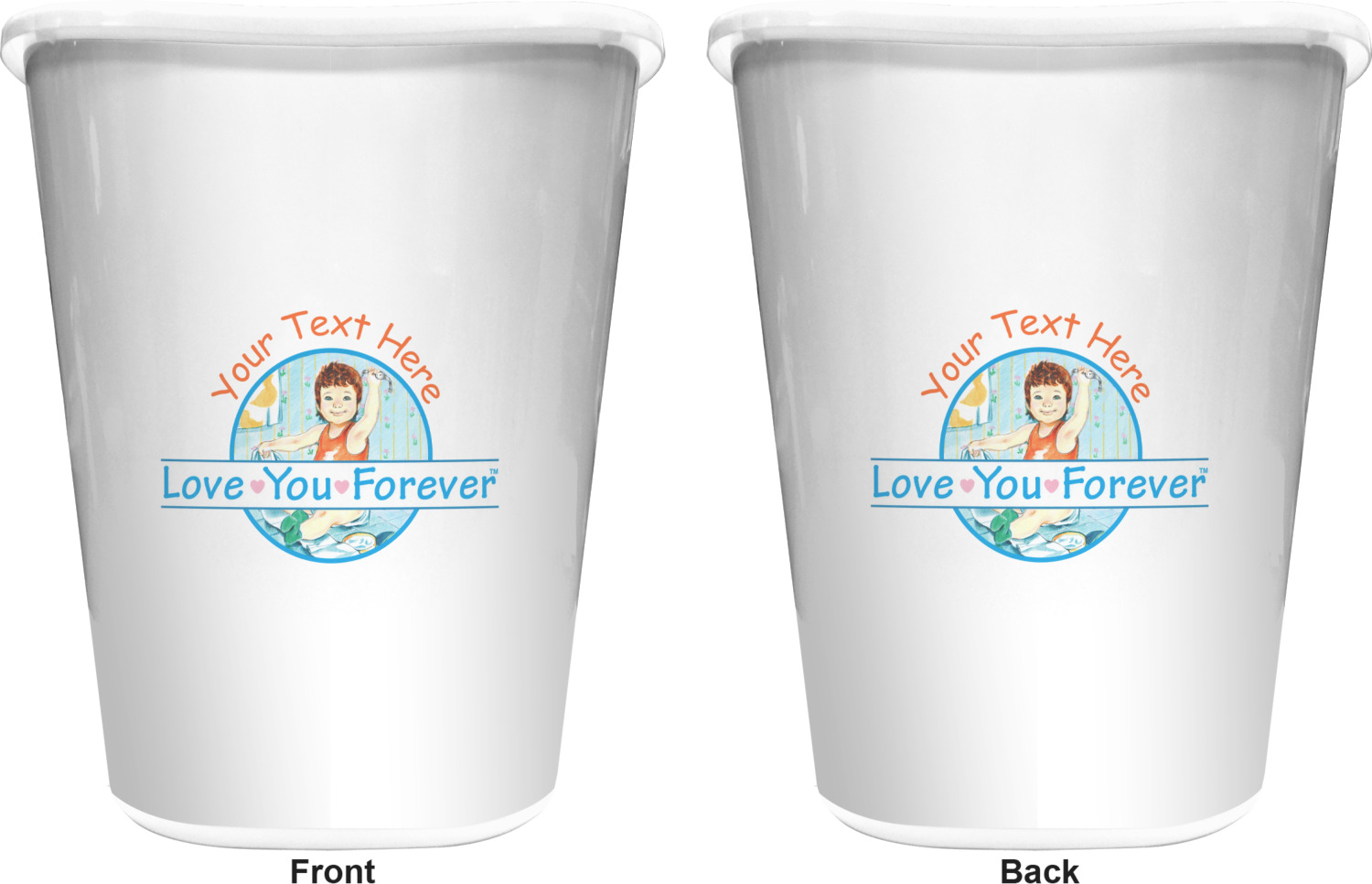 You can choose to purchase these decorative wastebaskets in either a white or a black color that will show on the base and the upper rim. Your customization is printed on a high-gloss, fine-quality vinyl adhesive, and you can choose to either have this adhesive applied to one side only or to both sides. As such, this plastic wastebasket can be single-sided or double-sided, depending on your creative vision. Your customization is printed using durable inks, making the design waterproof and resistant to fading over time.