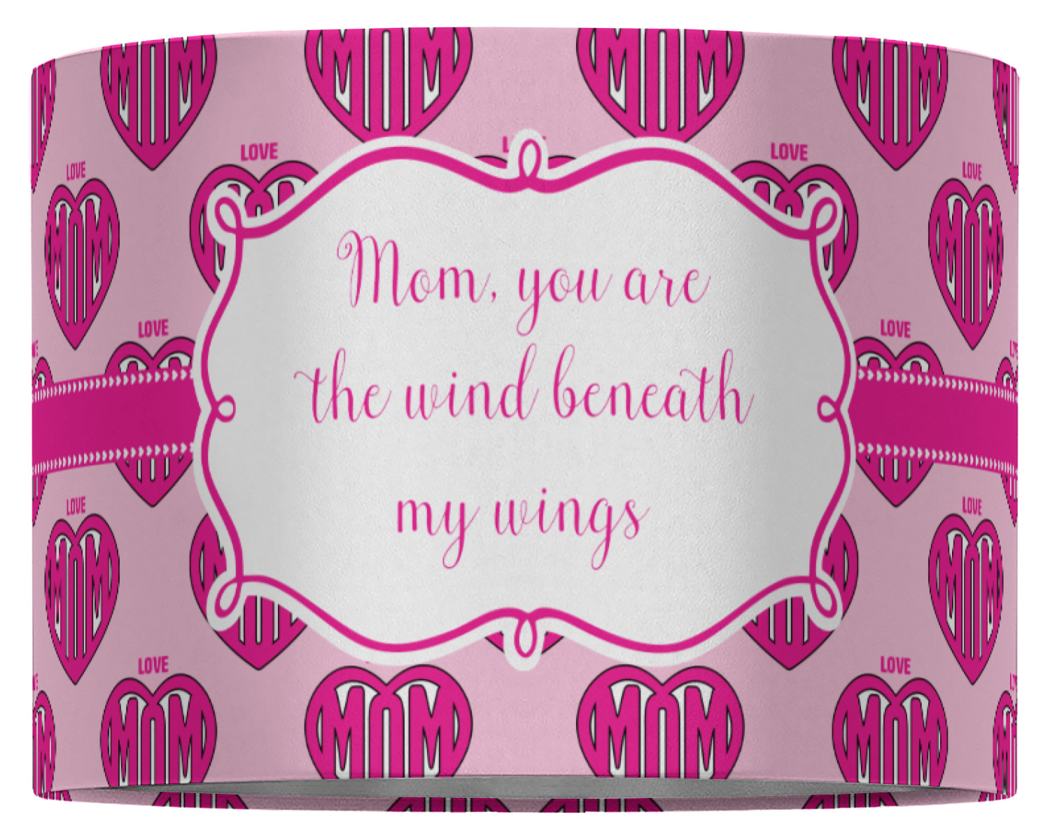 This design is perfect for Mother's Day and to show your mother how much you really love your mom! Our design background have the words Love & Mom; and the word Mom in inside a heart. We added our ribbon with hearts; we chose to use pinks and white and we chose to use a large label with the words "Mom, you are the wind beneath my wings".