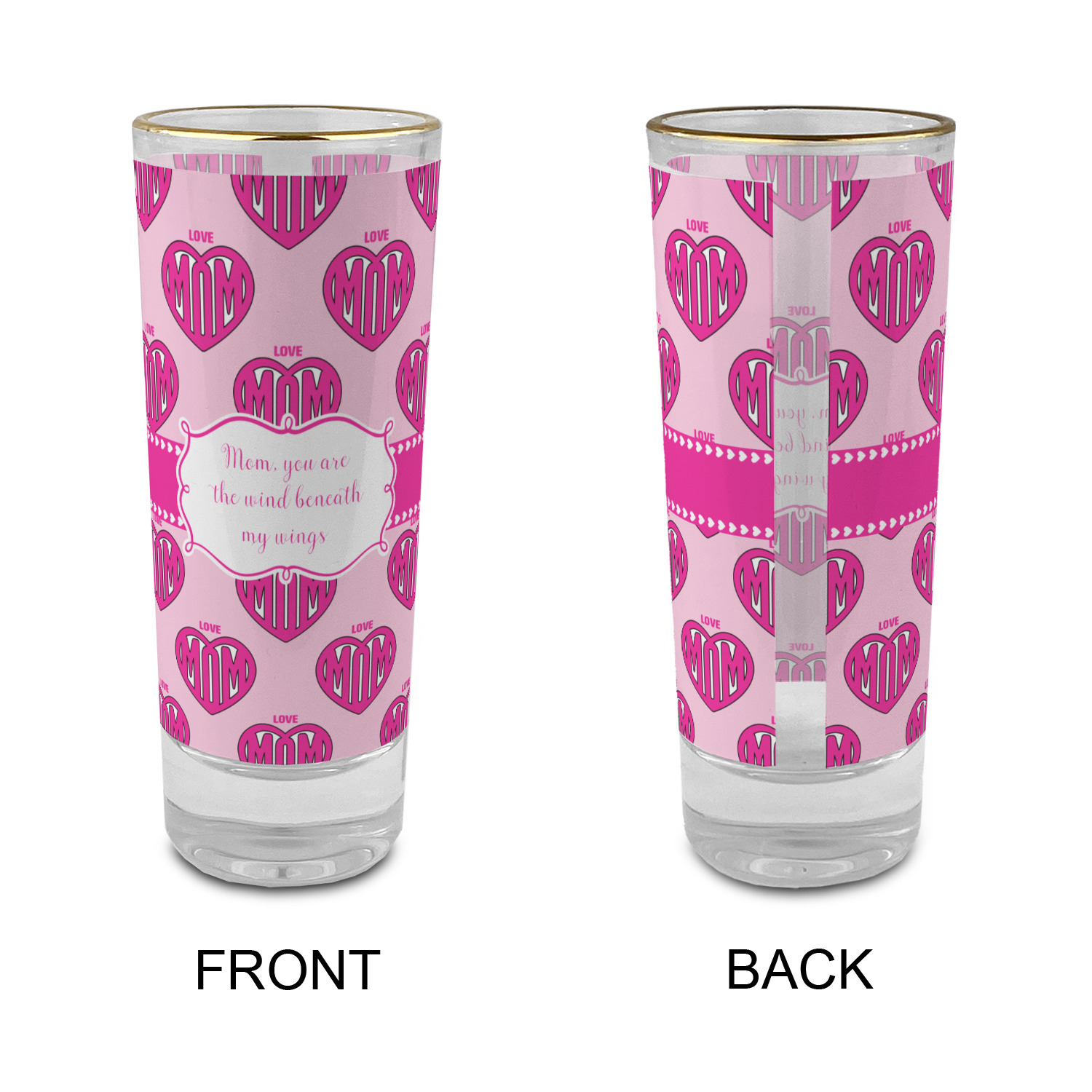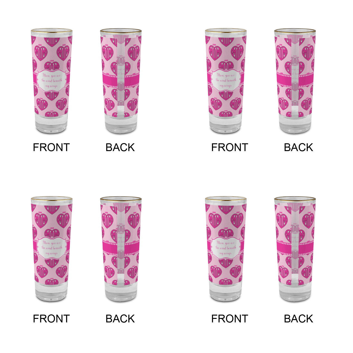 These glass shooter glasses are printed in full color with the design of your choice. These are a tall shooter 2 oz size and stand 4" tall. The print is a full wrap design to boldly display your personalization.