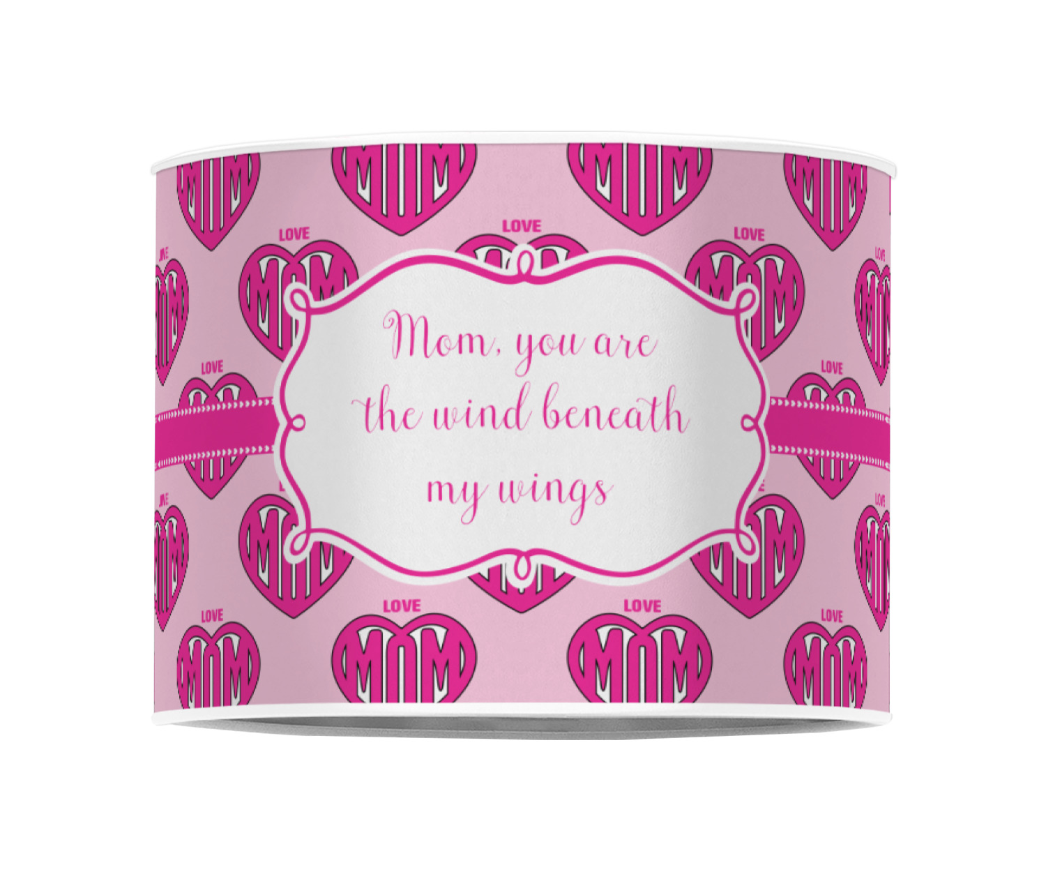 This design is perfect for Mother's Day and to show your mother how much you really love your mom! Our design background have the words Love & Mom; and the word Mom in inside a heart. We added our ribbon with hearts; we chose to use pinks and white and we chose to use a large label with the words "Mom, you are the wind beneath my wings".