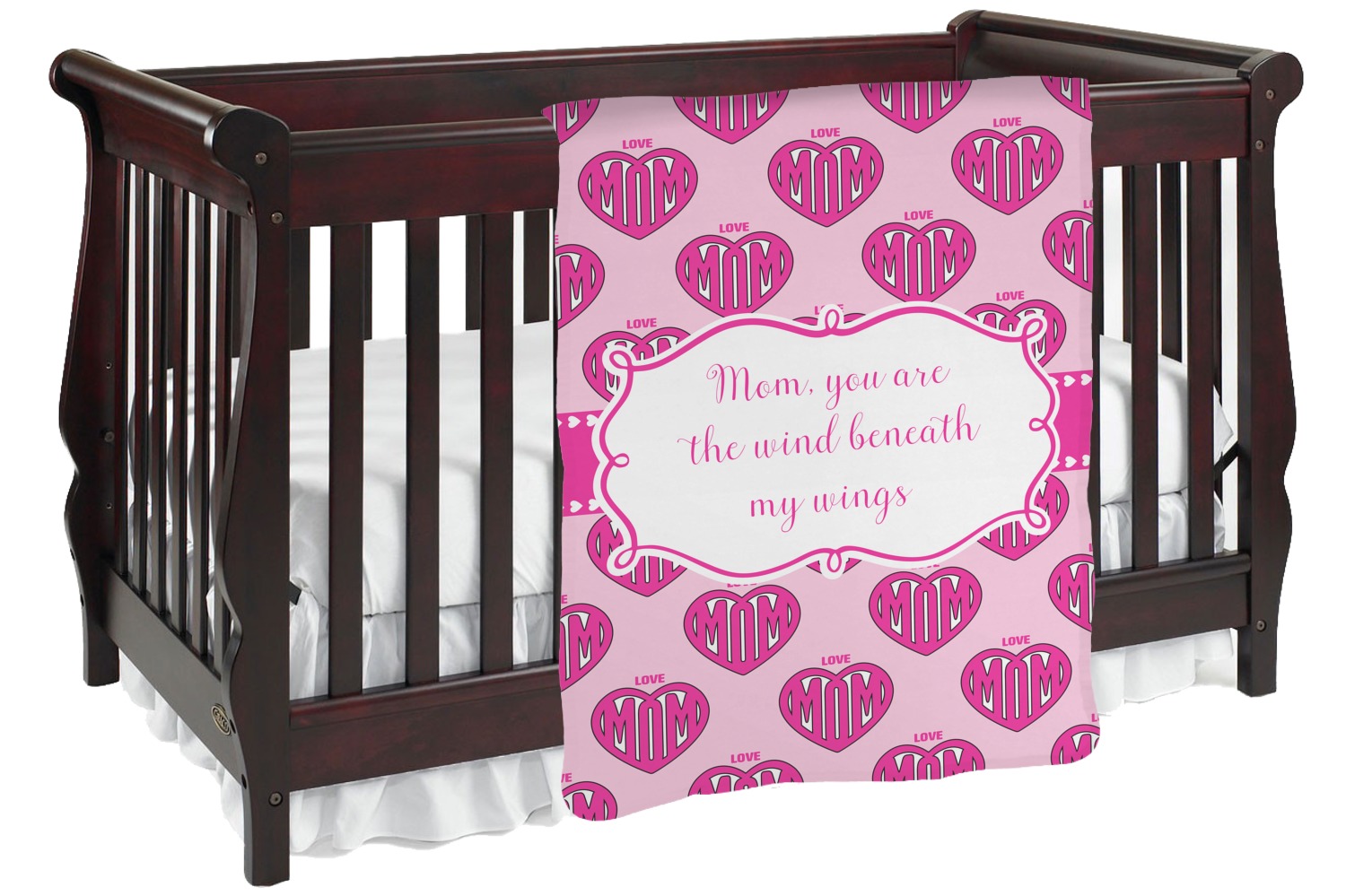 This design is perfect for Mother's Day and to show your mother how much you really love your mom! Our design background have the words Love & Mom; and the word Mom in inside a heart. We added our ribbon with hearts; we chose to use pinks and white and we chose to use a large label with the words "Mom, you are the wind beneath my wings".