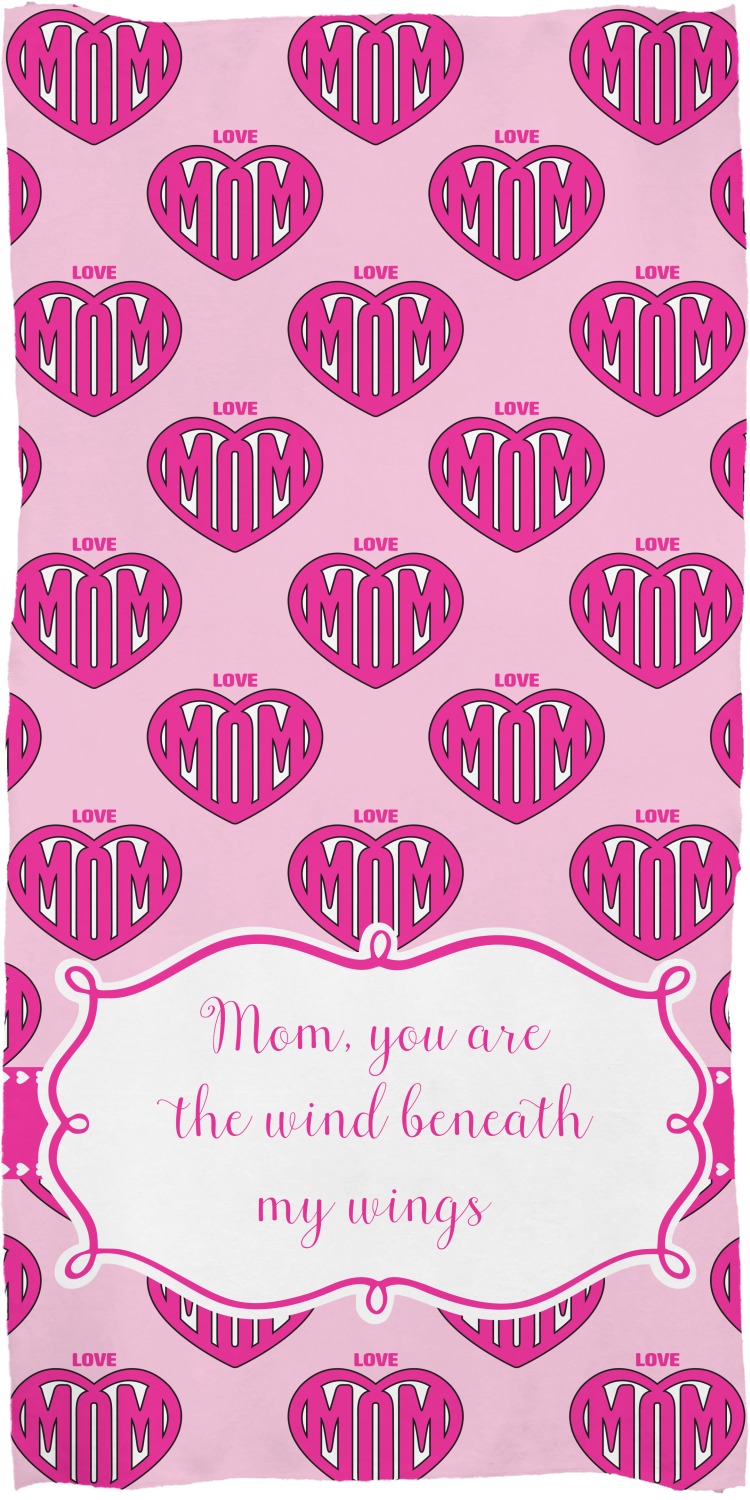 These customized bath towels are slightly larger than your standard towel and are the ideal size for wrapping around your body. They measure approximately 60" x 30". Your customization is displayed across the entire front face of the towel, while the back is white.