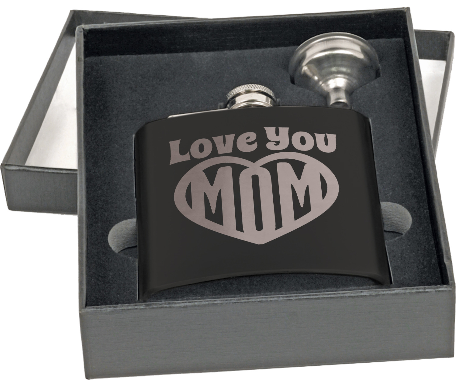 Built from a stainless steel and then covered with a black coating, this hip flask, has a very classy appearance. Similar to the standard flask, this stainless steel flask has the traditional curved shape for a snug fit in your palm. This flask set also includes a traditional screw and flip lid and liquid funnel in a gift box. At 4 by 4.5 inches, this flask can hold up to 6 ounces. Your personalized design is laser-engraved across the front of this flask.