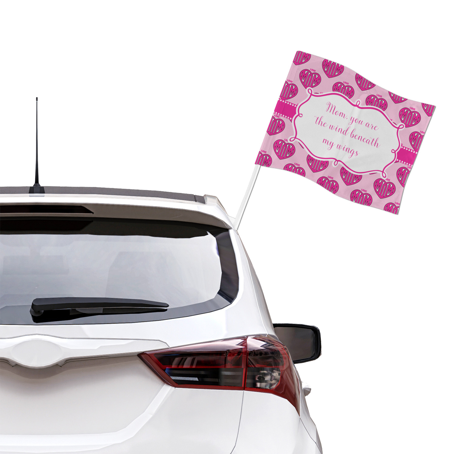 Our personalized flags are made from a durable, yet lightweight cloth that will proudly bear your logo or design of choice, while withstanding the outside elements. We have two size options - 8" x 11" and 11" x 15". Both come with a flag pole which includes a clip that secures the pole to the side window, whether it is rolled up or down. The flags are printed on both sides to display your design from all directions.