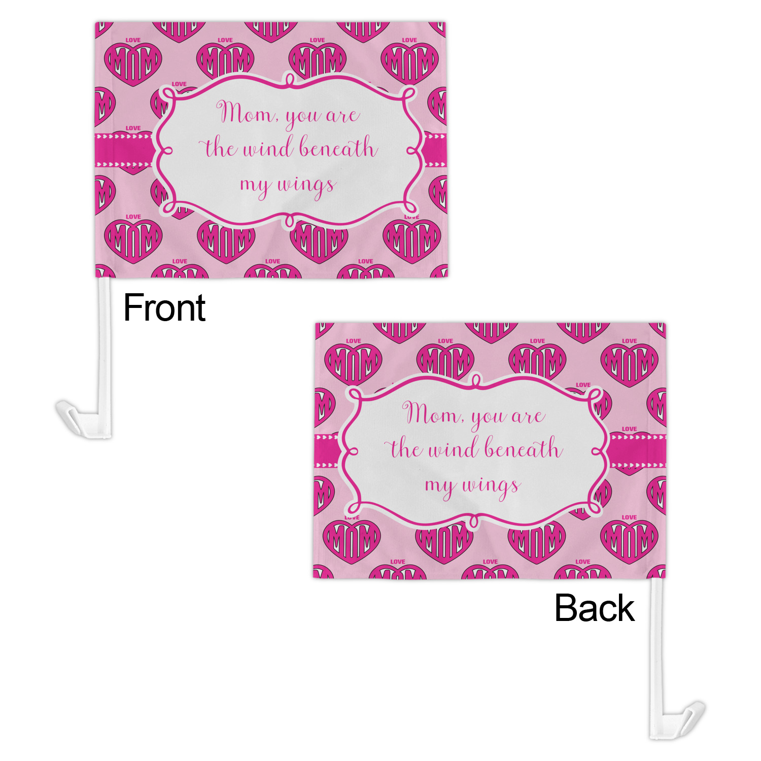 Our personalized flags are made from a durable, yet lightweight cloth that will proudly bear your logo or design of choice, while withstanding the outside elements. We have two size options - 8" x 11" and 11" x 15". Both come with a flag pole which includes a clip that secures the pole to the side window, whether it is rolled up or down. The flags are printed on both sides to display your design from all directions.