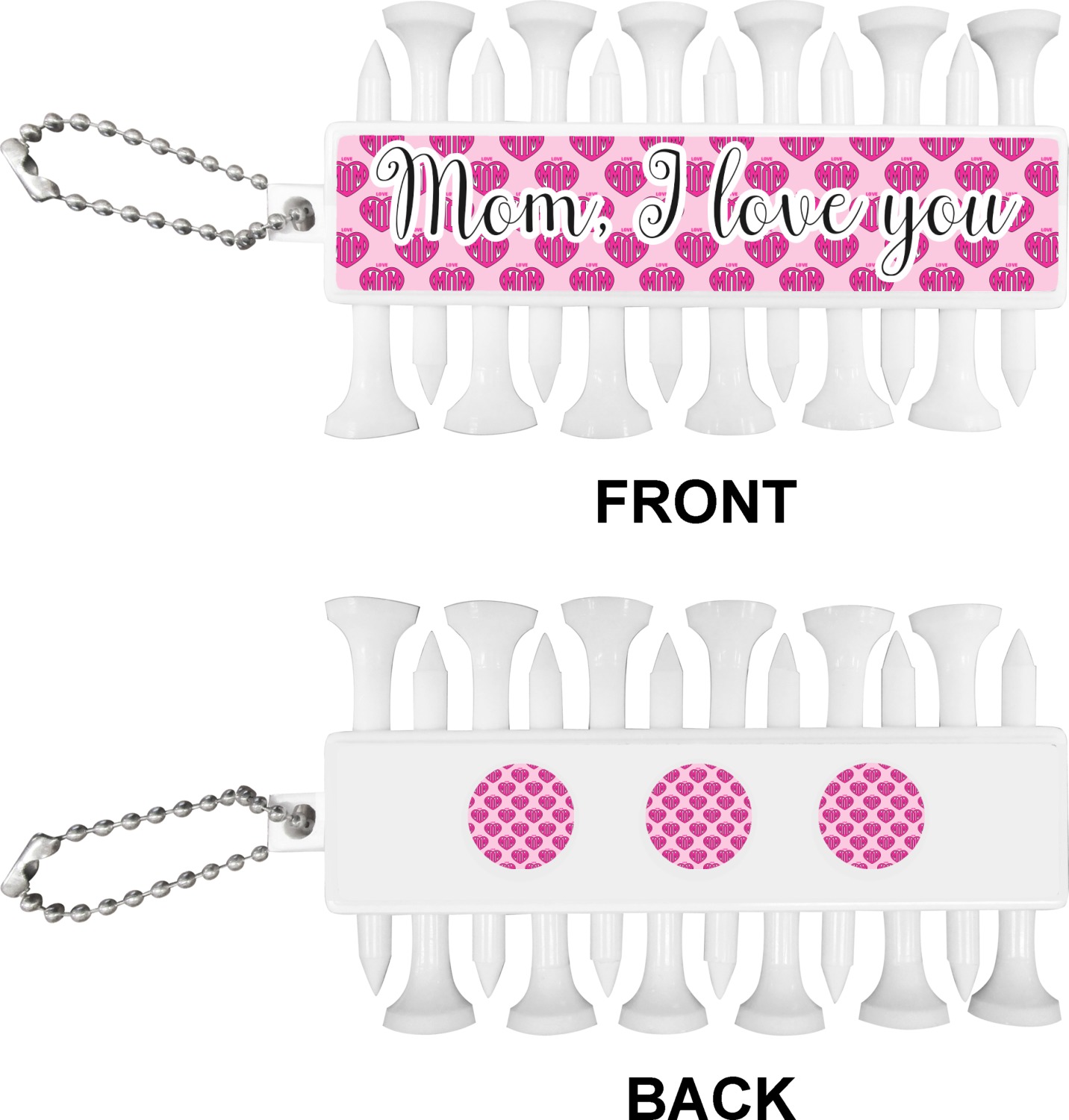 With 12 tees on a lightweight, portable key chain, it almost ensures a great 18 holes. Our tees are made of white plastic and are a little over 2". Design the front and the back of the golf tee holder. Pick from over a hundred designs, colors, and personalization styles! The set even comes with three removable ball markers as well!