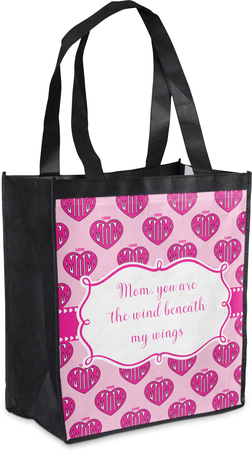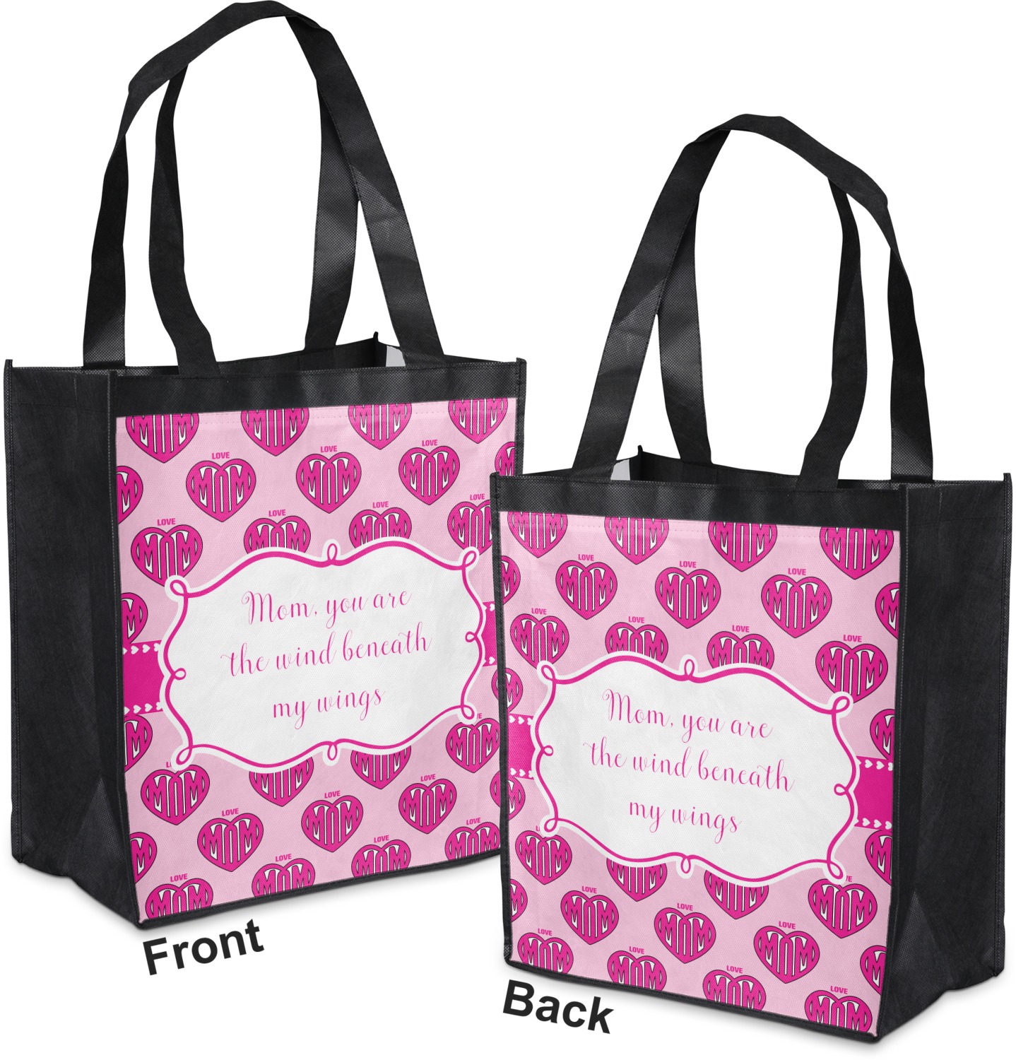 Made from a durable, biodegradable material, these reusable shopping bags can support up to 30 pounds of weight. With two large handles, measuring at 8.5 inches each, these personalized tote bags are easy to carry to your vehicle or home. The bag itself is 12 by 13.5 inches, and can expand to a depth of 7 inches. Your customization is printed on both the front and back, while the remaining sides, trim, and handle are a sleek, charcoal black.