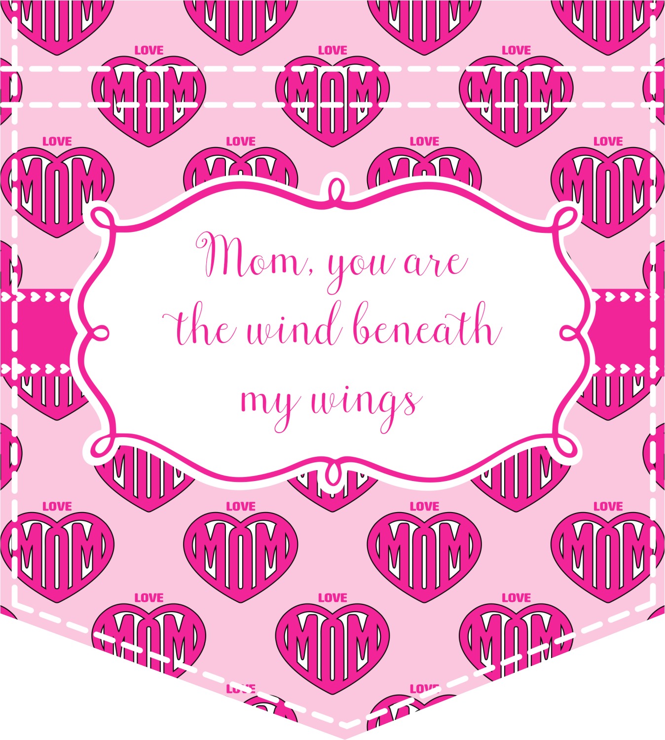 This design is perfect for Mother's Day and to show your mother how much you really love your mom! Our design background have the words Love & Mom; and the word Mom in inside a heart. We added our ribbon with hearts; we chose to use pinks and white and we chose to use a large label with the words "Mom, you are the wind beneath my wings".