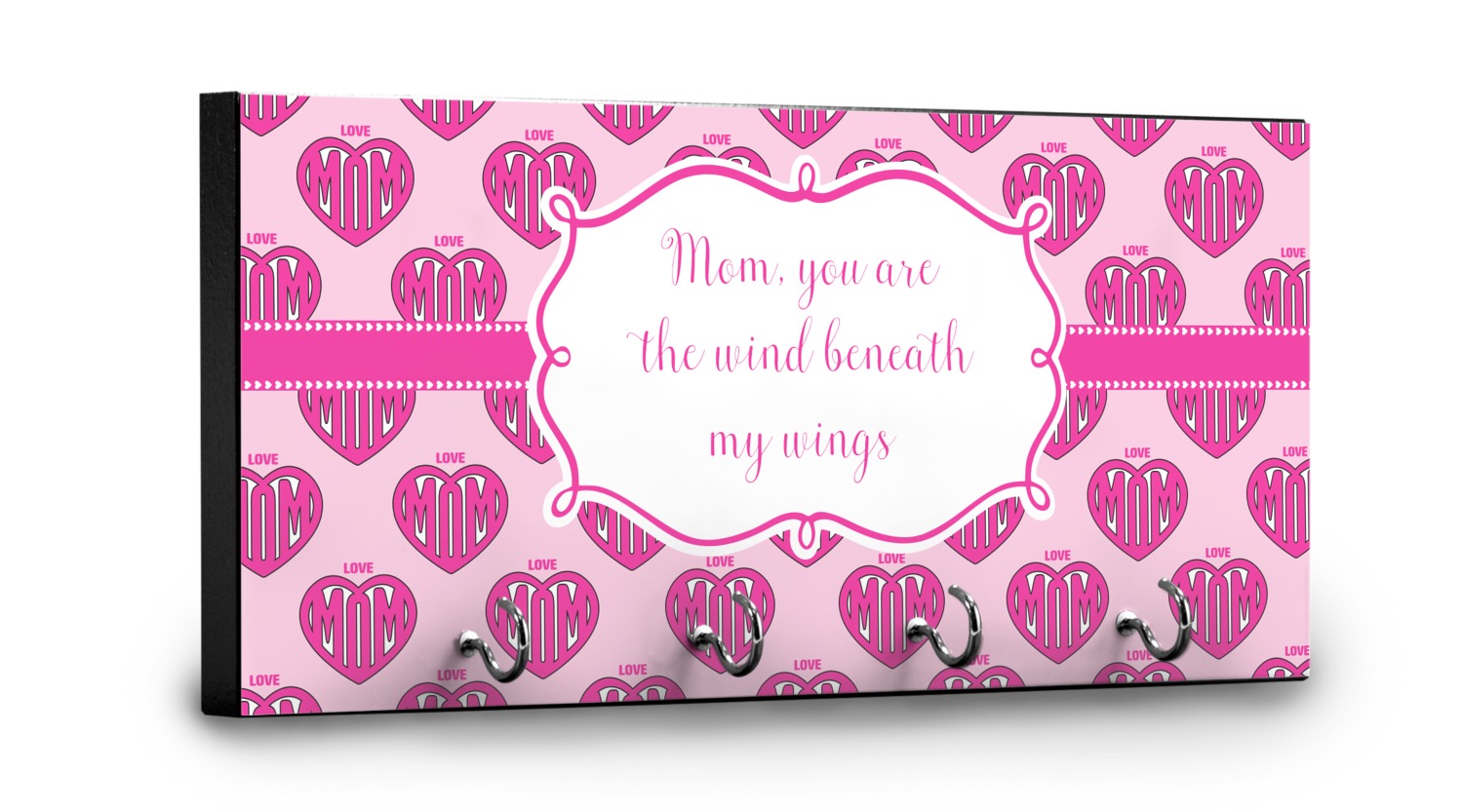 This design is perfect for Mother's Day and to show your mother how much you really love your mom! Our design background have the words Love & Mom; and the word Mom in inside a heart. We added our ribbon with hearts; we chose to use pinks and white and we chose to use a large label with the words "Mom, you are the wind beneath my wings".