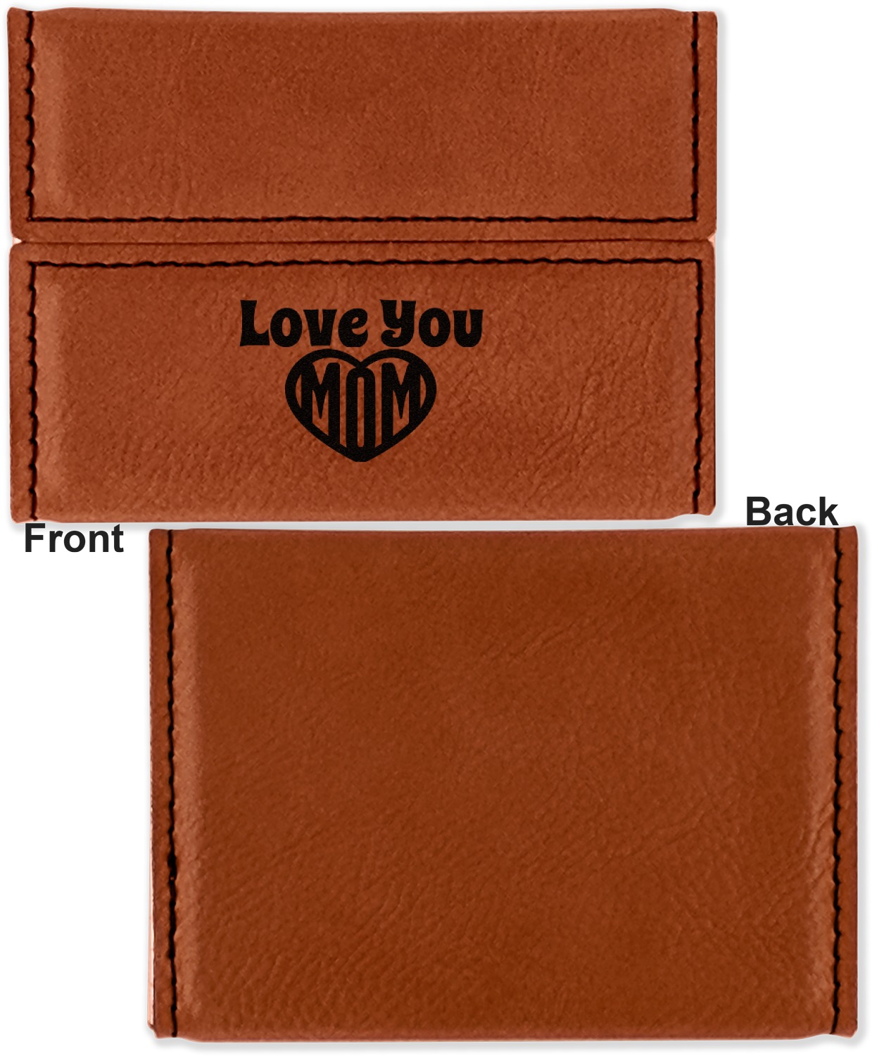 Your personalized design is laser engraved onto either the front, or the front and back of the card holder, depending on the model you purchase. Once engraved, the design will appear a darkened black against the cognac color of the leatherette.