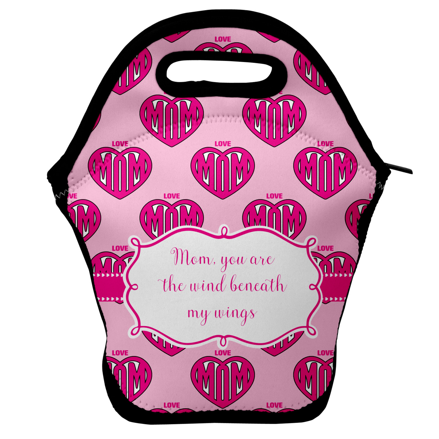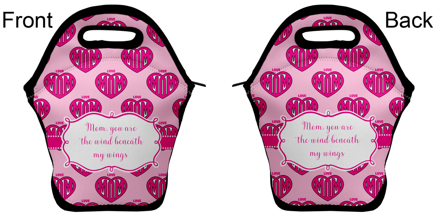 Our personalized lunch bags are made from a strong neoprene, and secure with a zipper closure that lines the top of the bag.The edges of the neoprene are sewn together with a heavy duty stitch, adding to the durability of the bag. The is accompanied by a reinforced handle at its top, for the easy transport of your lunch. We display your personalization across both the front and back of this neoprene lunch bag, while the remaining sides are a sleek black in color. Each bag measures at 13.5 inches tall, and 11.5 inches wide.