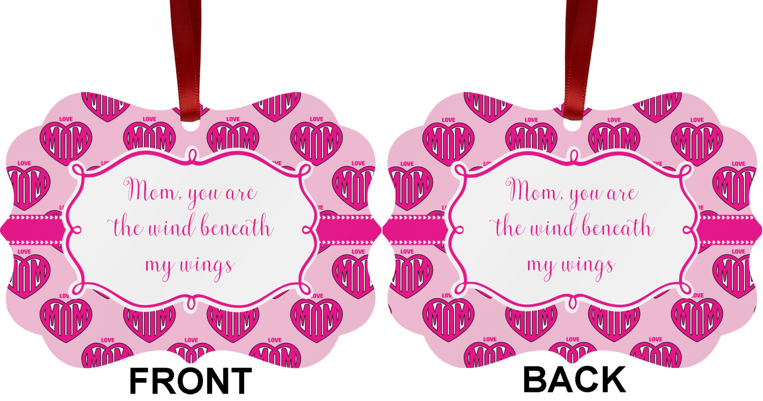 This design is perfect for Mother's Day and to show your mother how much you really love your mom! Our design background have the words Love & Mom; and the word Mom in inside a heart. We added our ribbon with hearts; we chose to use pinks and white and we chose to use a large label with the words "Mom, you are the wind beneath my wings".