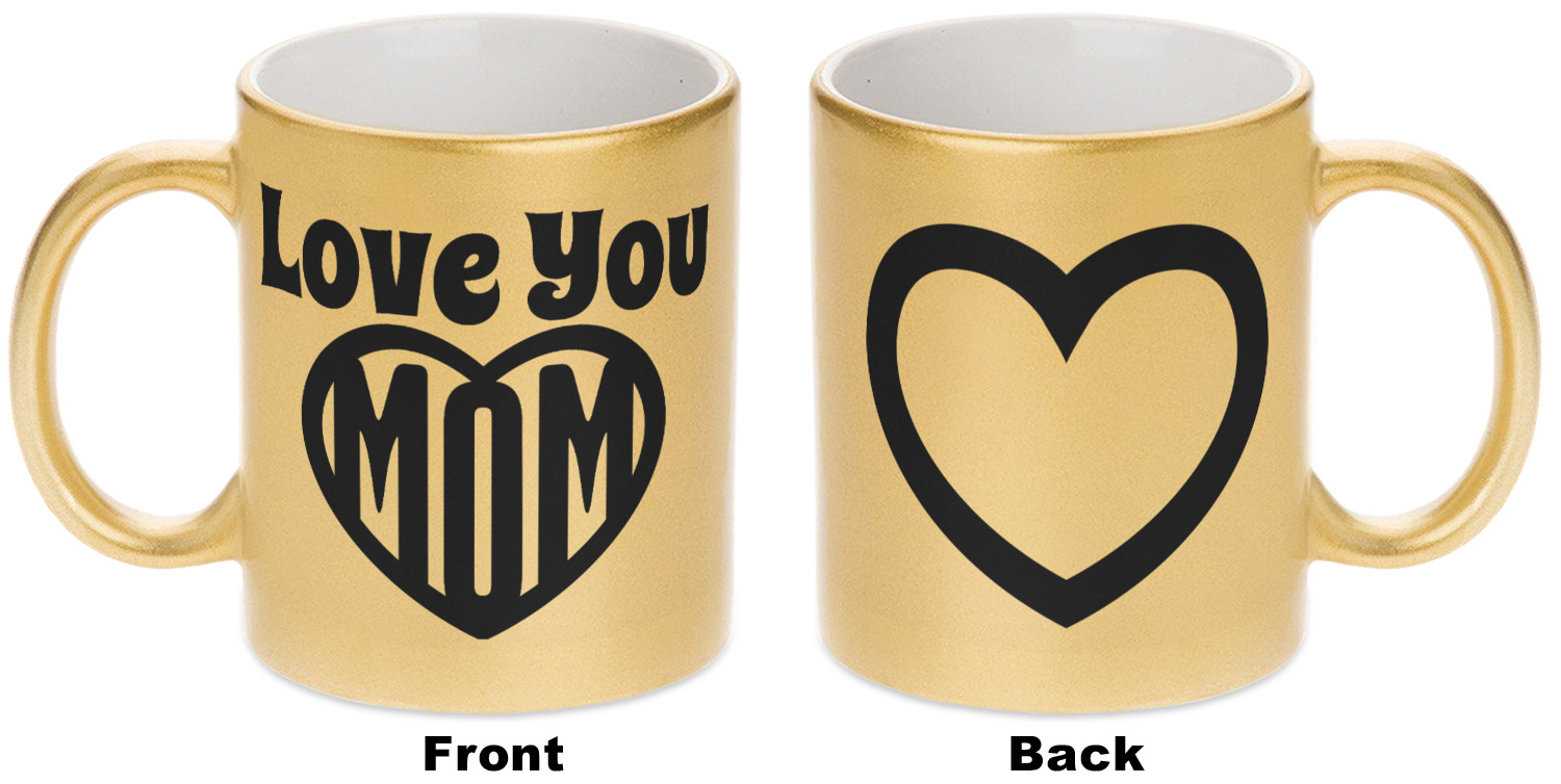 Our custom mugs are ceramic, which is great for keeping your tea or coffee warm! We offer two metallic mugs to personalize - Silver or Gold. Both styles hold around 11oz and have dimensions of approximately 3.75" x 3.5" x 4.75". Both the metallic mugs come in a matte finish and have glitter detailing to add a more pristine feel to the gold and silver base colors.