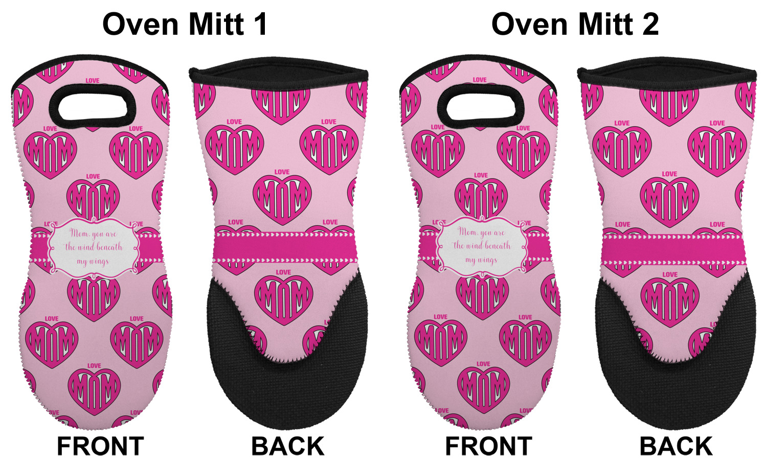 These heat resistant gloves are made entirely of a durable neoprene; the front features a softer texture, while the palm's side has a textured surface, meant to handle heat up to 500 degrees Fahrenheit. Thick, heavy duty stitching connects the two sides. A small, oval cutout appears on the front, and can be used to hang and store the mitt. Your personalization appears on the front, and the upper part of the back of the mitt. The style of these oven mitts are suitable for both the right and left hand, depending on your needs. If you need one for each hand, be sure to order two!