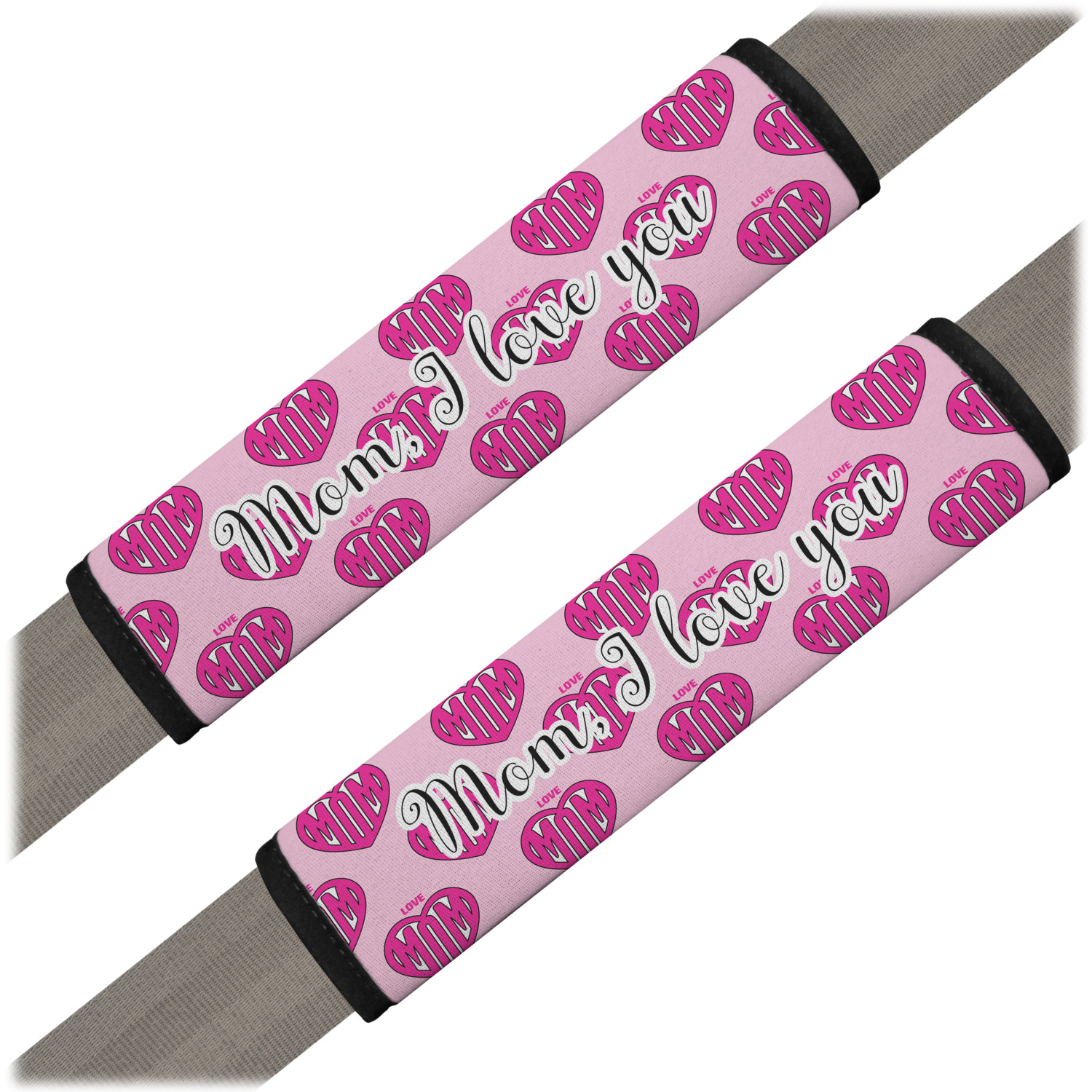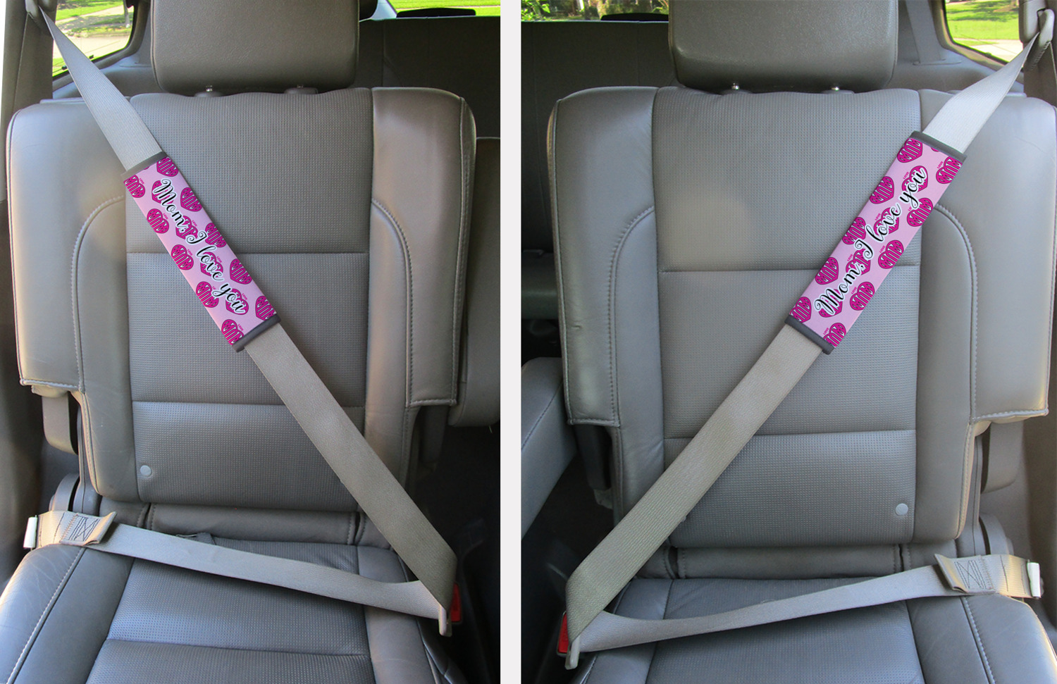 Made from neoprene, our seat belt strap covers wrap around the belt itself and have a Velcro tab for easy attachment and closure. The belt's edges are trimmed with a black polyester for a secure finish. Each cover is 9.5 by 7 inches when open and 9.5 by 2.5 inches when closed. We print your personalized design on the face of the seat belt pad.