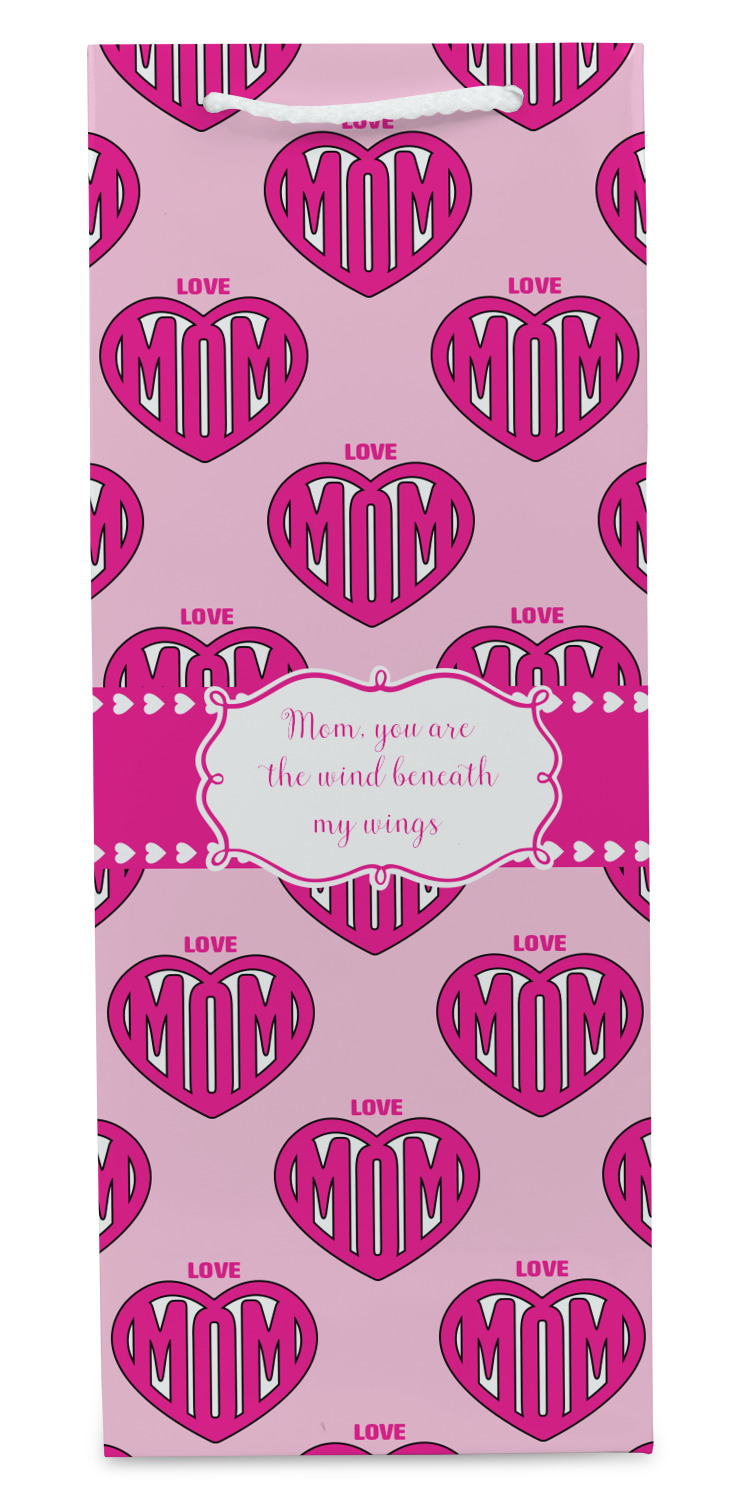 This design is perfect for Mother's Day and to show your mother how much you really love your mom! Our design background have the words Love & Mom; and the word Mom in inside a heart. We added our ribbon with hearts; we chose to use pinks and white and we chose to use a large label with the words "Mom, you are the wind beneath my wings".