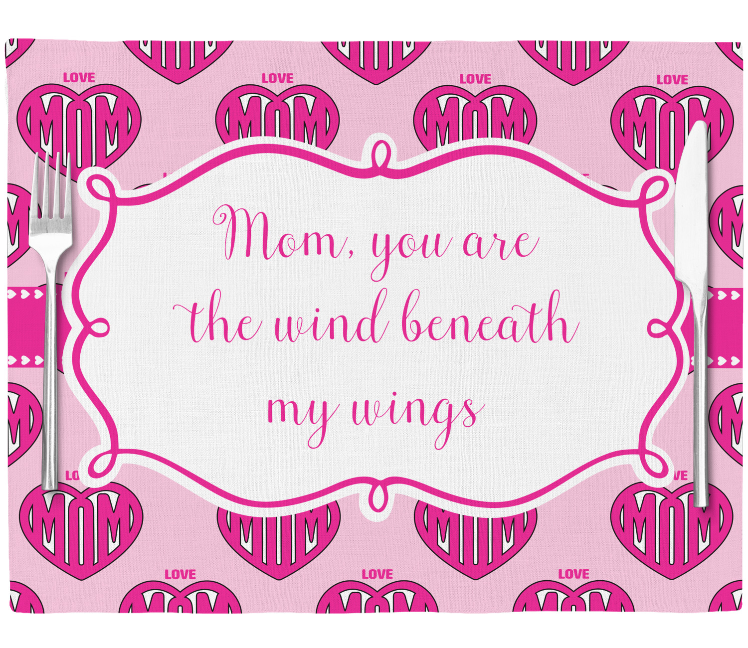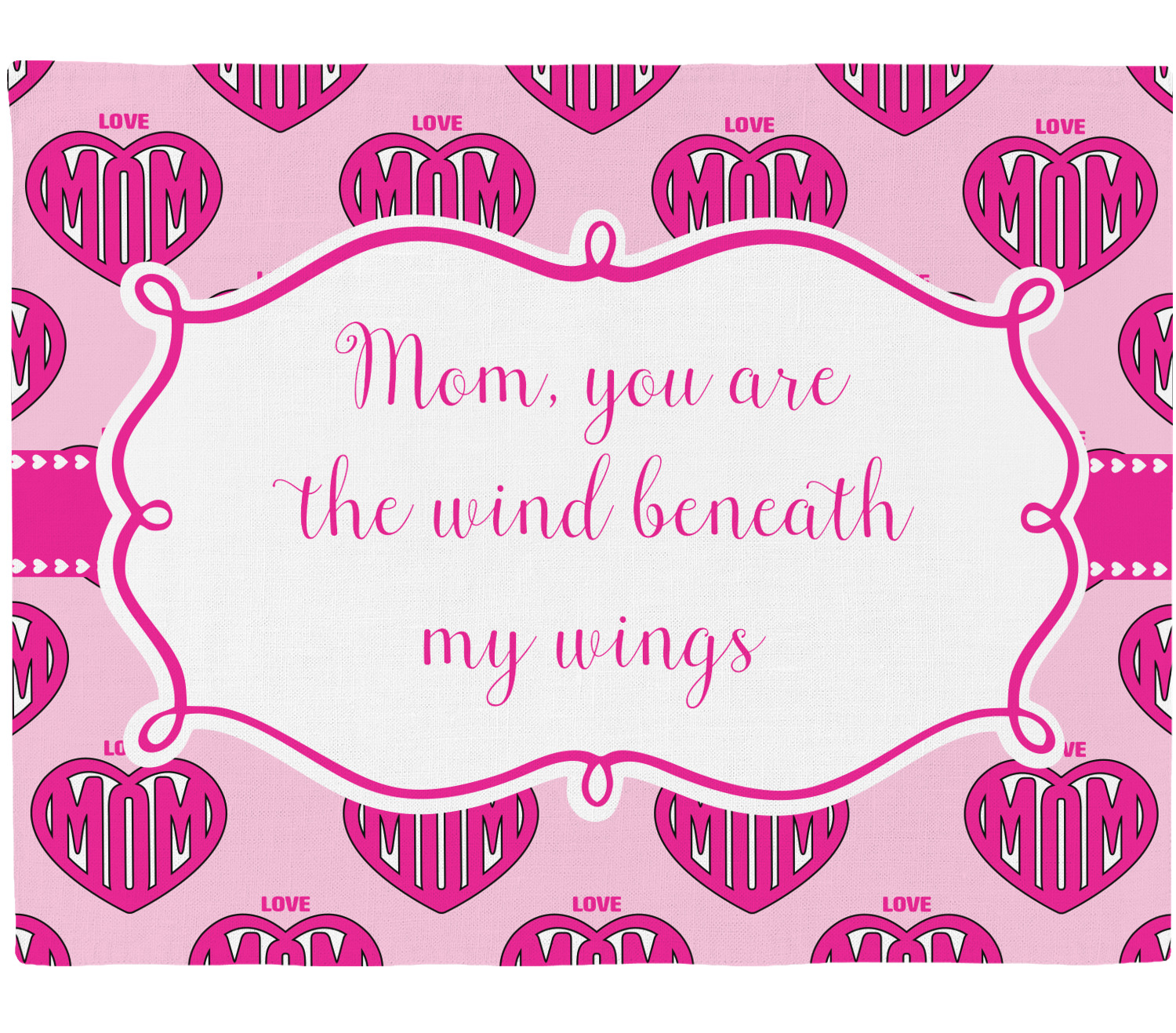 This design is perfect for Mother's Day and to show your mother how much you really love your mom! Our design background have the words Love & Mom; and the word Mom in inside a heart. We added our ribbon with hearts; we chose to use pinks and white and we chose to use a large label with the words "Mom, you are the wind beneath my wings".