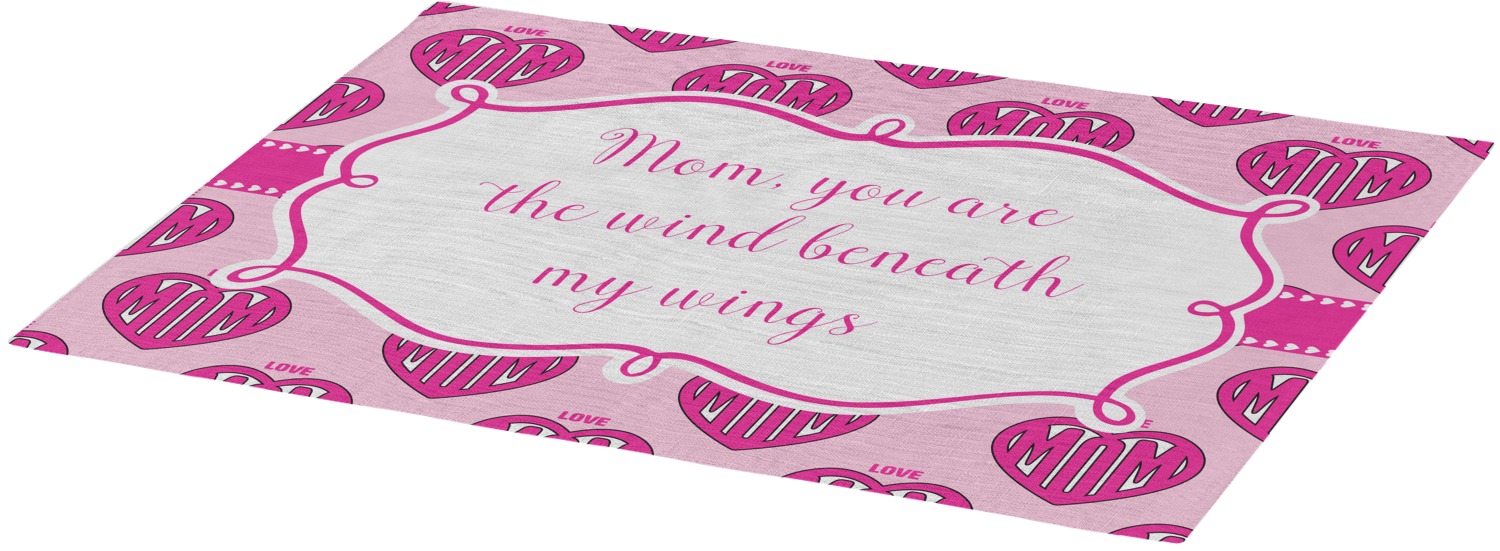 Each of our table mats are a poly twill material with woven burlap detailing. This creates a soft, quality placemat for us to fully print your personalized design across. The woven twill also adds a wrinkle-free surface to set your table! Each customizable placemat is a rectangle shape measuring at approximately 13 x 18 and printed here in the USA.