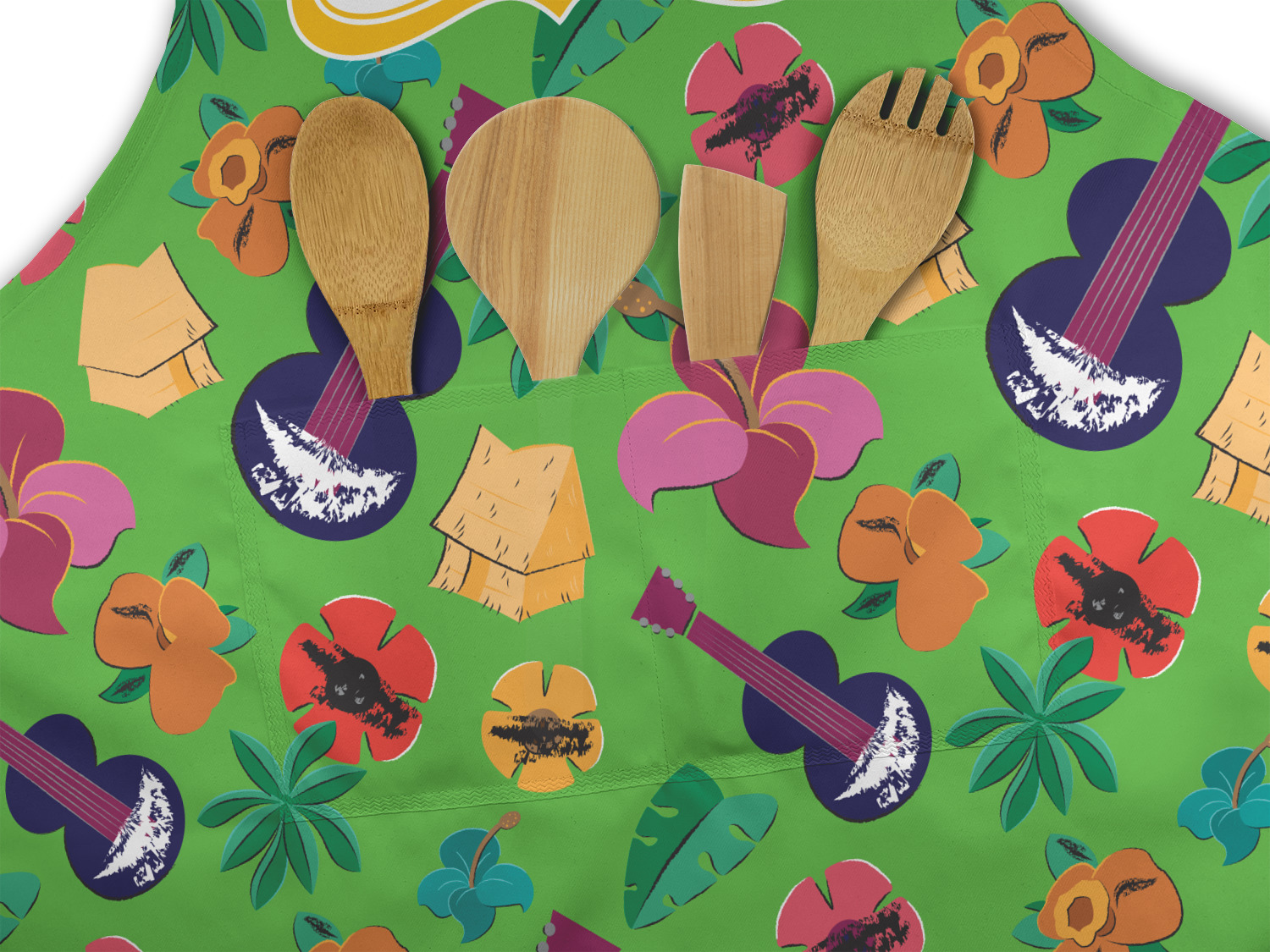 What's more classic Hawaiian than ukuleles, tiki huts, and flirty flowers? This bright design will send you straight back to better days, spent lounging on a beach in some tropical paradise.