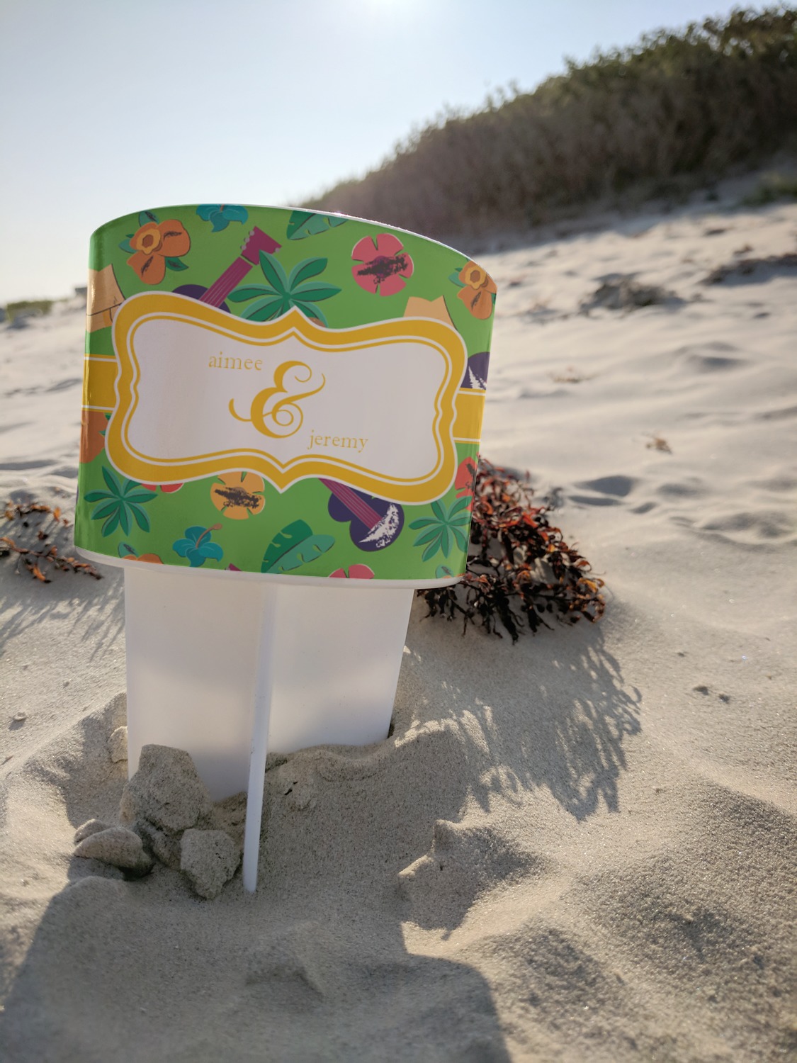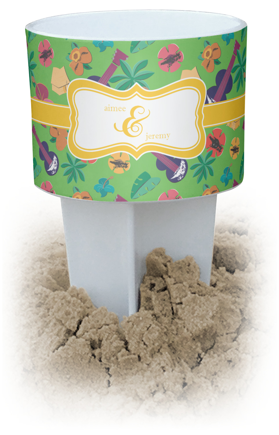 This cup holder has a large stake at its bottom that anchors it to the sand or ground below, while the cup holder rests above the stake. The entire drink holder is made of durable plastic and displays your customization around the cup holder portion. We sell these personalized beach spikers in two different colors: black and white.