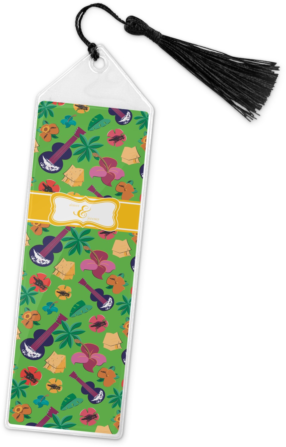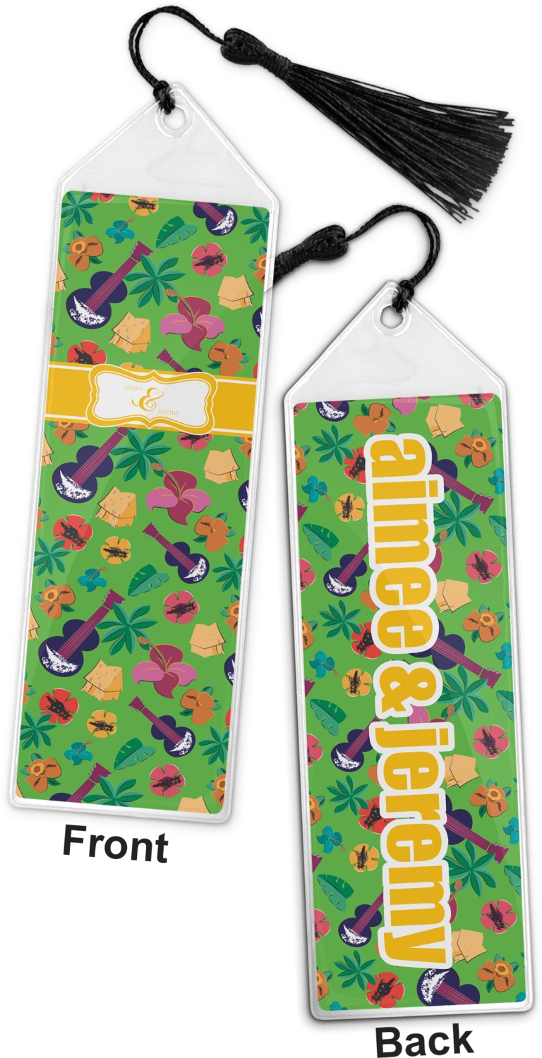 Your personalized bookmark is made of a sturdy, clear vinyl, and is approximately 7.5" x 2.25". We display your personalization on vinyl inserts that are placed on both sides. Accompanying each book marker is a black, fringe tassel that attaches to the reinforced, triangular header.