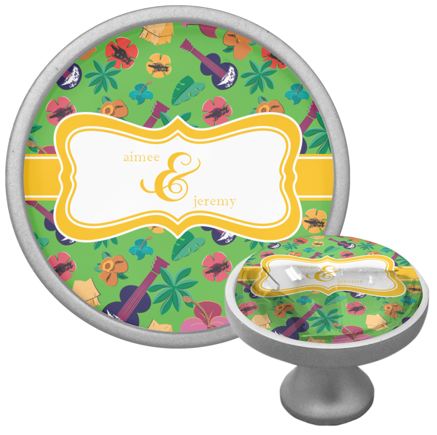 We sell these cabinet pulls in two different colors to better match your room's color scheme. We offer an oil-rubbed bronze base that is black in color, and a satin nickel option, which has a silver color. Your design is displayed across a high gloss vinyl insert that is placed on top of these cabinet handles. We then place a 1 inch thick glass cabochon atop the design, which seals the cabinet knob and makes the colors of your customization stand out. These custom cabinet knobs are approximately 1.3 inches in diameter. Your purchase includes a 1 inch screw that can be used to mount the knob to any cabinet in your home.