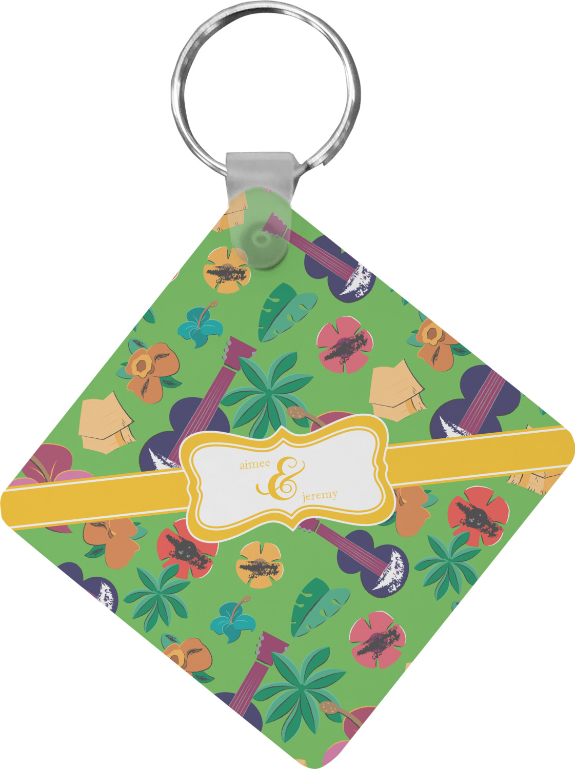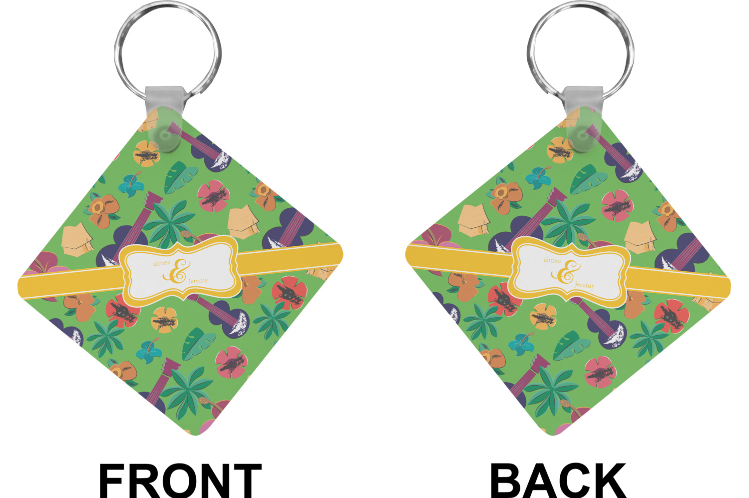 Our personalized keychains attach to the included metal, split key ring with a plastic, removable snap. Since a metal ring is included with your purchase, you have the liberty to keep your keys together on the ring, with or without your unique keychain. We offer this keychain in three different shapes: circle, heart, or diamond. We print your personalized design(s) on both sides of the key chain, and the surface has a glossy, reflective finish that only emphasizes your design. Each keychain is approximately 2.25 by 2.25 inches.
