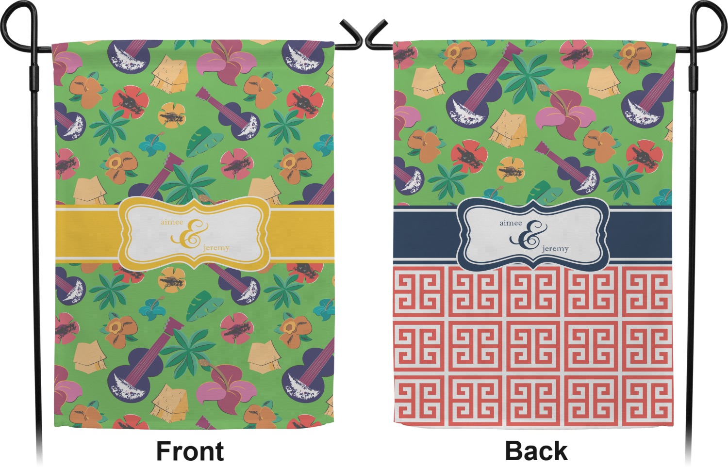 These custom garden flags are made of a durable, double-ply, polyester weave, allowing them to withstand the elements year round. The small flags measure at approximately 12 by 18 inches. The large flags measure out to 28 by 37 inches. You can order these decorative flags with your customization printed on the front only, or the front and back.