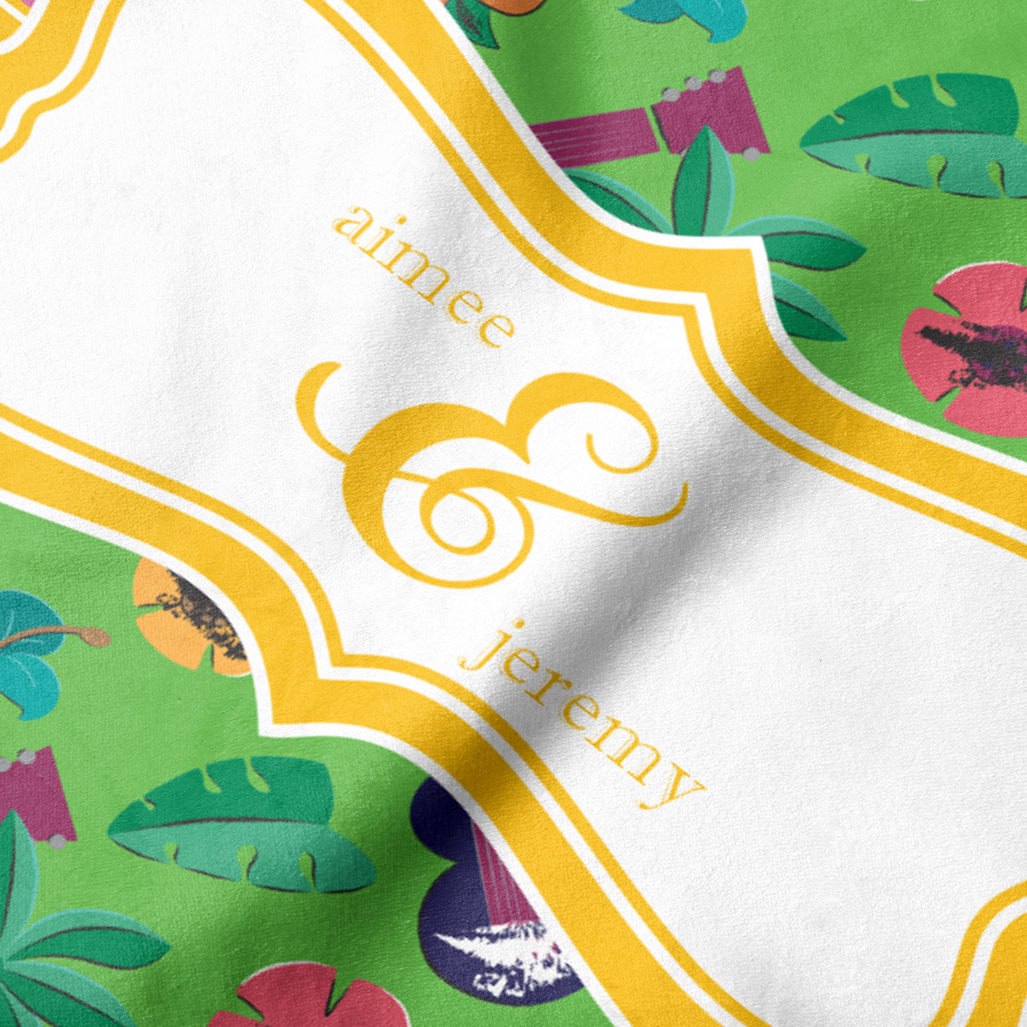 What's more classic Hawaiian than ukuleles, tiki huts, and flirty flowers? This bright design will send you straight back to better days, spent lounging on a beach in some tropical paradise.