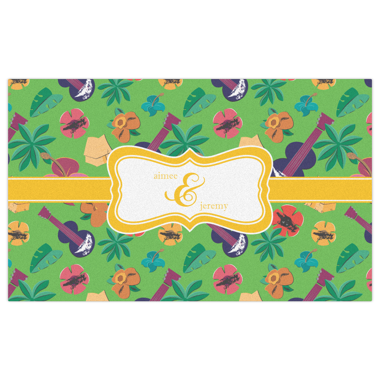 What's more classic Hawaiian than ukuleles, tiki huts, and flirty flowers? This bright design will send you straight back to better days, spent lounging on a beach in some tropical paradise.
