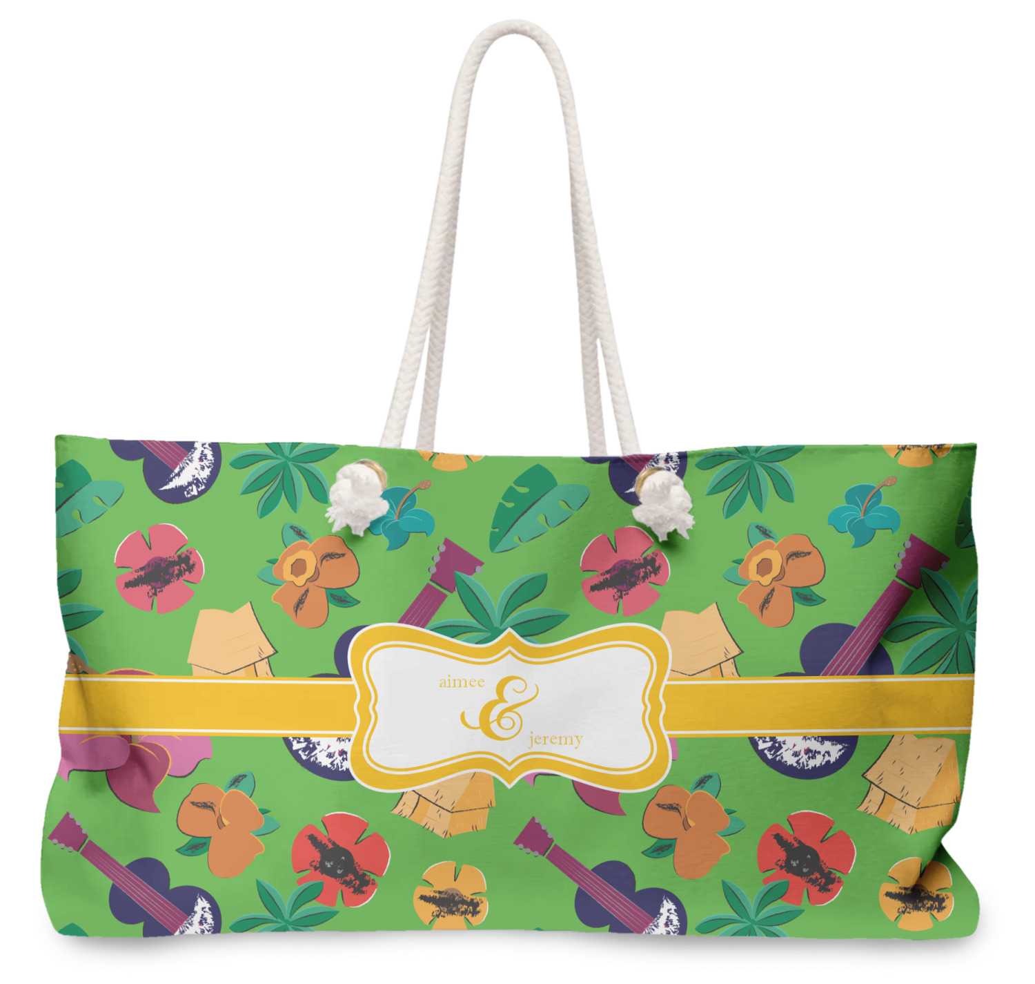 Our oversized weekender tote with rope handles is perfect for your weekend at the beach or on the town. This large tote are 24" W X 13" H, with a 5" gusset and a 27" thick rope handles with a knot that is put through a grommeted brass hole.