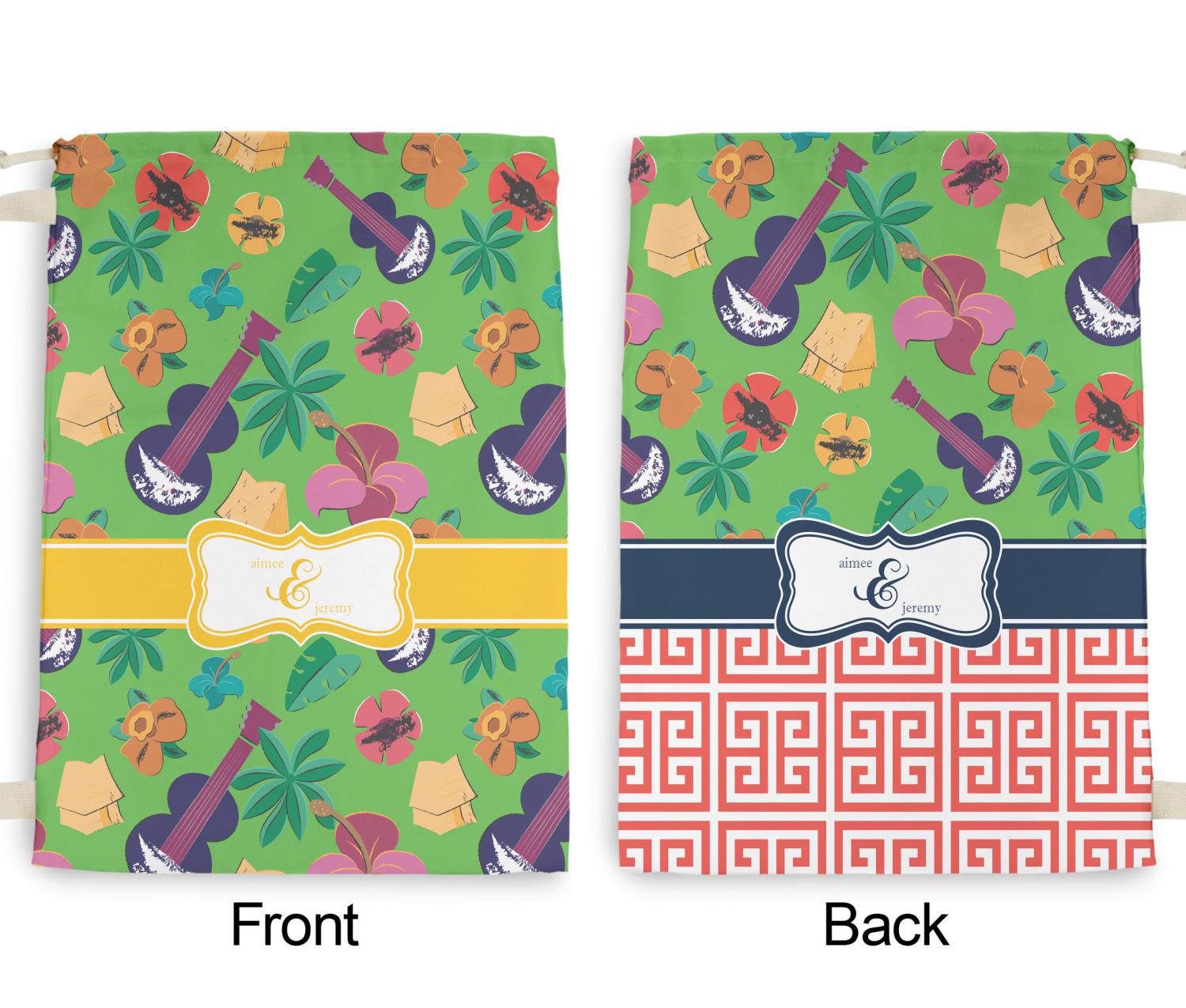 Carry your laundry in style with these customized laundry bags. Available in two sizes, featuring a natural colored woven strap and a cinch cord, these bags hold a lot of clothes or anything else you want to fit in them.