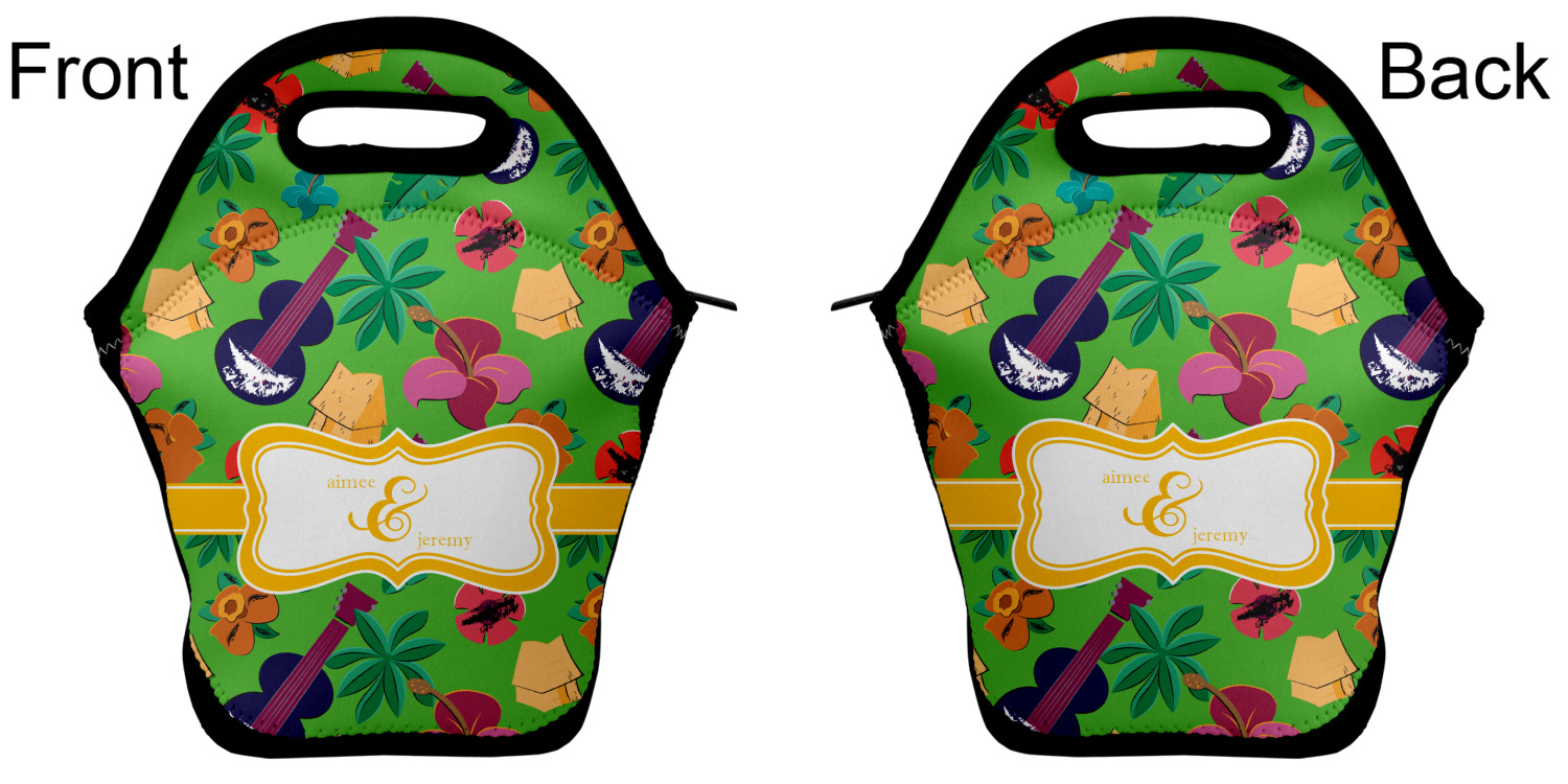 Our personalized lunch bags are made from a strong neoprene, and secure with a zipper closure that lines the top of the bag.The edges of the neoprene are sewn together with a heavy duty stitch, adding to the durability of the bag. The is accompanied by a reinforced handle at its top, for the easy transport of your lunch. We display your personalization across both the front and back of this neoprene lunch bag, while the remaining sides are a sleek black in color. Each bag measures at 13.5 inches tall, and 11.5 inches wide.