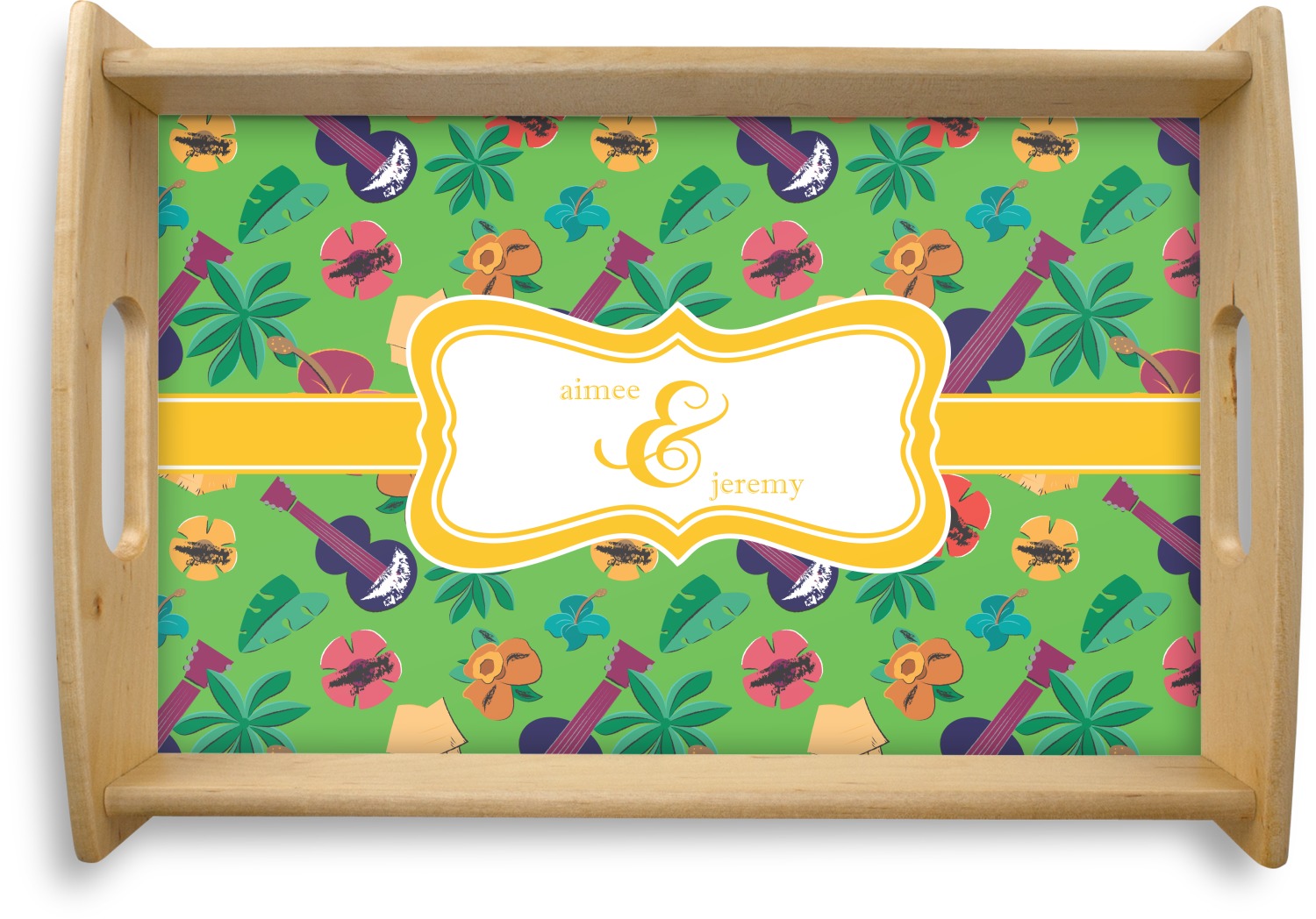 This serving tray with handles features square edges and two rounded sides, creating a very modern look. Each side is fabricated from a beautifully cut, natural wood. The bottom of the interior of the tray displays your customized design in bright, vibrant color. The tray is sold in both a black color and a natural wood look. Each variation of the wood serving tray has two sizes: Small, which is 14" x 10" x 2.25", and Large, which is 19.5" x 13.5" x 2.75".