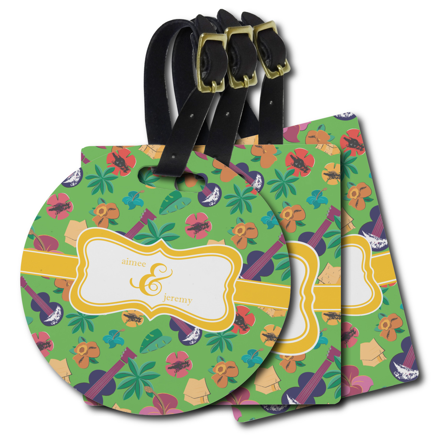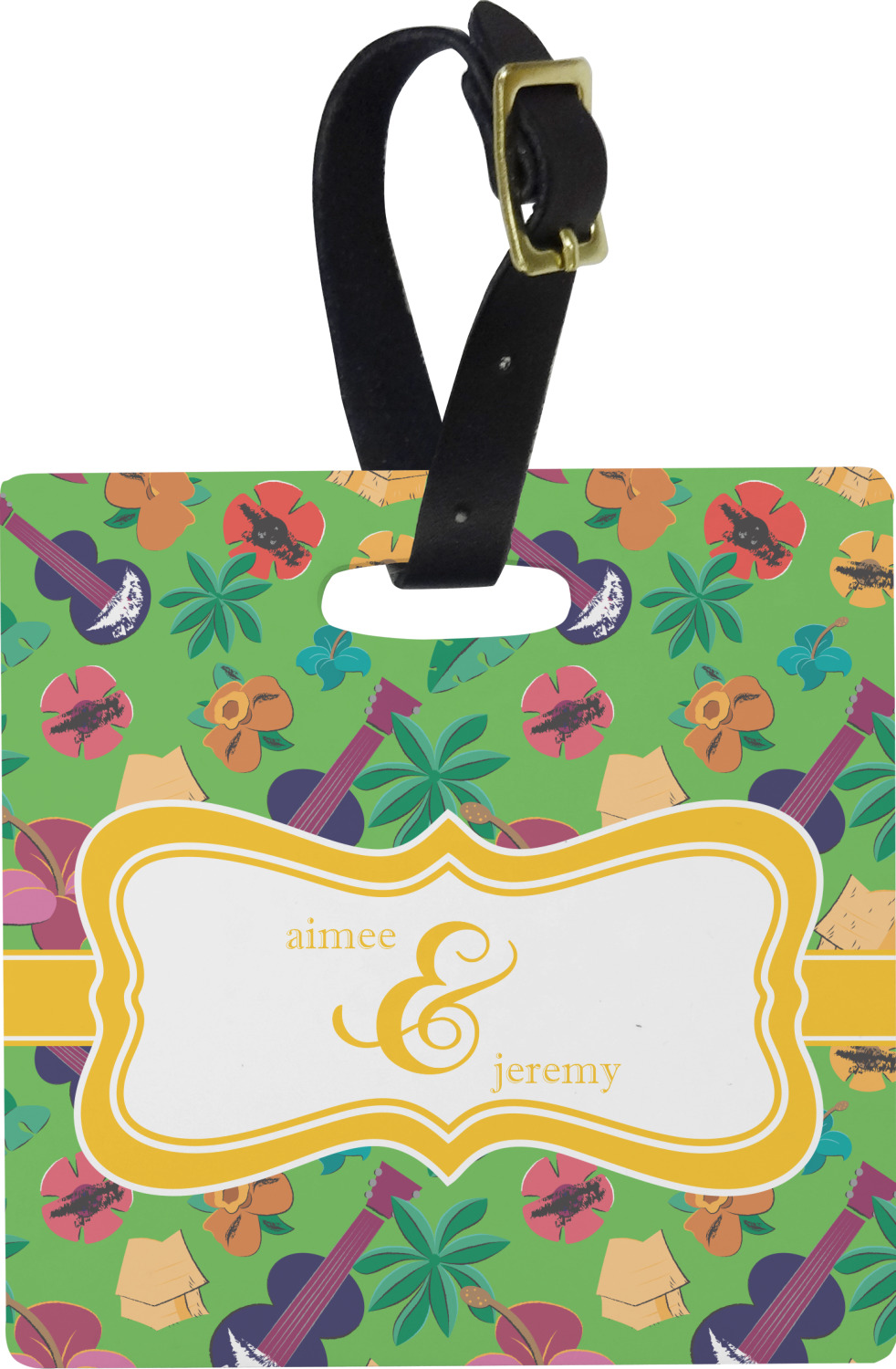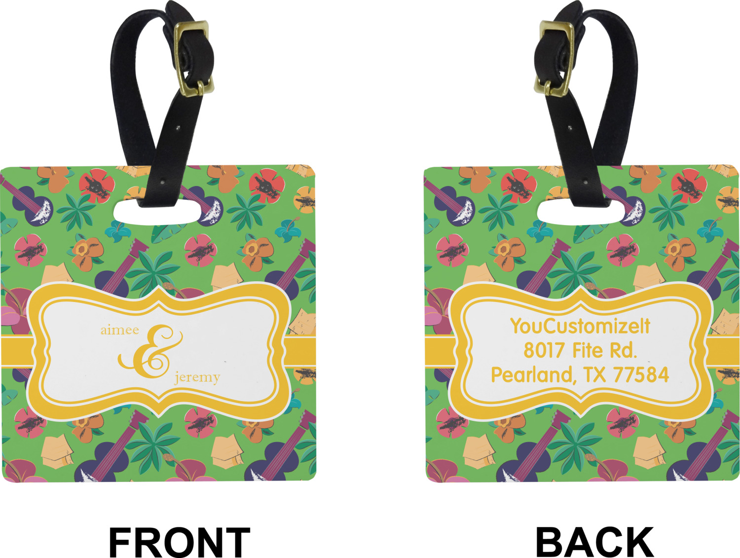 These personalized bag tags are sold in a variety of shapes, so that you may find the product that meets your vision exactly. We sell a round luggage tag, which measures at approximately 4" x 4". Our square luggage tag is about 3.5" x 3.5", while our rectangular version is 2.75" x 4 ".