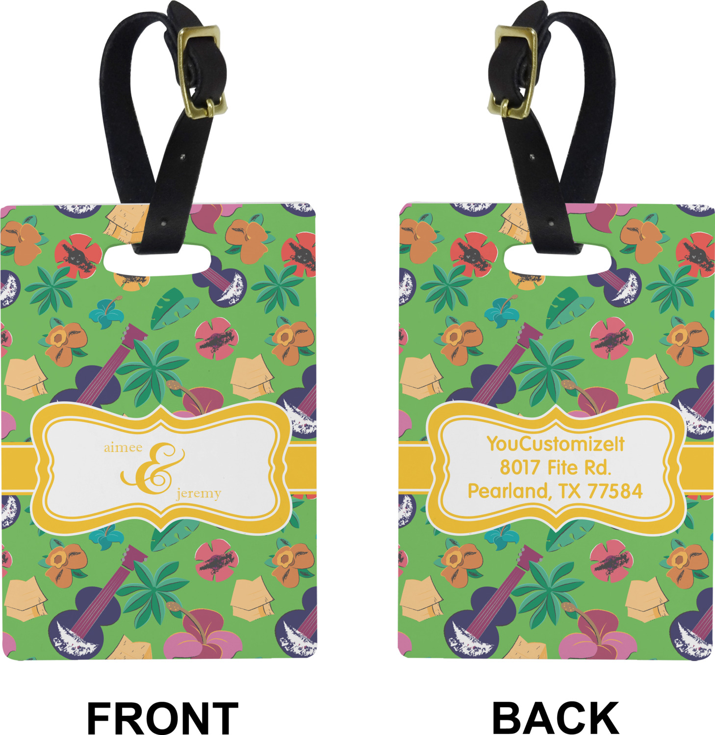 These personalized bag tags are sold in a variety of shapes, so that you may find the product that meets your vision exactly. We sell a round luggage tag, which measures at approximately 4" x 4". Our square luggage tag is about 3.5" x 3.5", while our rectangular version is 2.75" x 4 ".