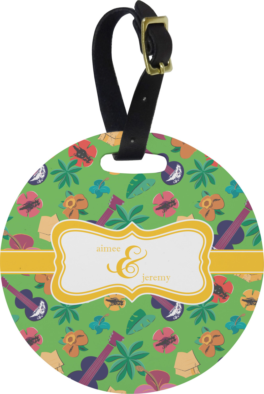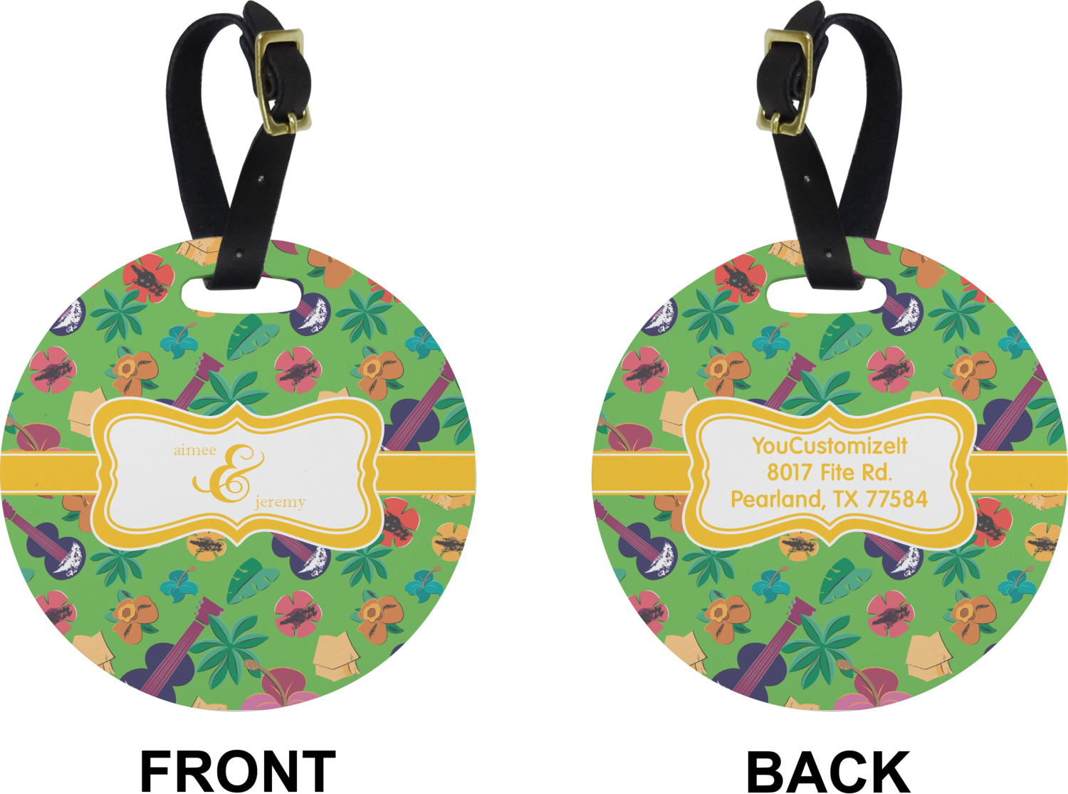These personalized bag tags are sold in a variety of shapes, so that you may find the product that meets your vision exactly. We sell a round luggage tag, which measures at approximately 4" x 4". Our square luggage tag is about 3.5" x 3.5", while our rectangular version is 2.75" x 4 ".