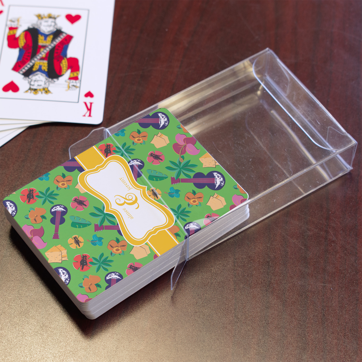 The customization / personalization is printed on the back side. The playing cards have a low gloss coating on both sides. The cards are packaged in a clear plastic box.