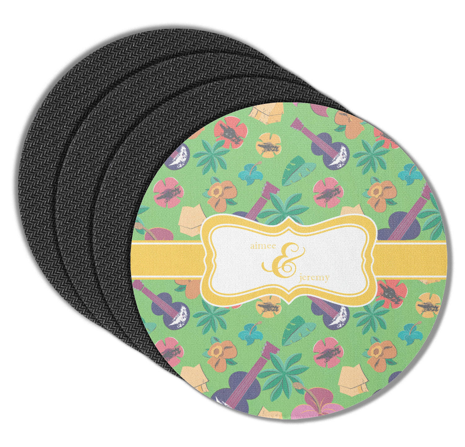 These drink coasters have a smooth, polyester top and a textured, rubber backing on its bottom. The non-slip rubber backing underneath works to keep any spills at bay. At 4 by 4 by 0.25 inches thick, these custom coasters are a suitable size for most drinkware. Your personalization is displayed atop the face of the cup coaster. We sell these rubber coasters in two different shapes: square and round. You can buy each shape as singulars or as a set of 4.